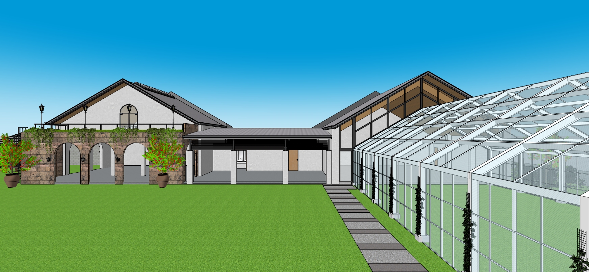 first of all do not add anything into the model just enhance all existing components in the photo this is an open empty building with stucco paint finish for the walls and rectangular cut adobe stone for the feature wall with the arches follow the scale of the textures in the photo there is also a skylight above the roof of the left most building the middle building features an open gathering area with dark gray horizontal louvers at the facade above light gray colored columns as shown in the 3d the whole frontage is just short cut grass area the roof is dark gray ribbed type metal roofing the ceiling and eaves are all wood plank design using pvc material add realistic sky and clouds and enhance color quality