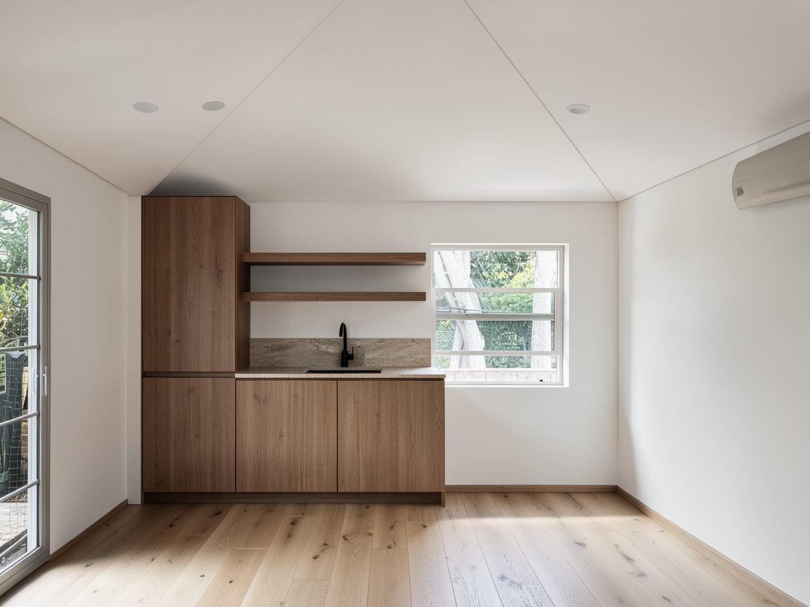 add a bench cabinet to the right of the kitchen in the same cabinetry