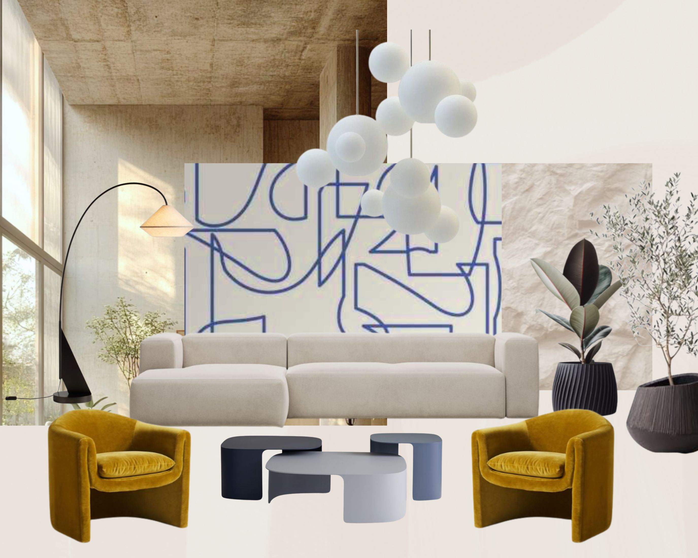 create modern livingroom interior using moodboard furniture colors and materials everything in natural size and spacing to look good the room should be very spacy and high ceilings walls in concrete and big windows loft style loft style interior