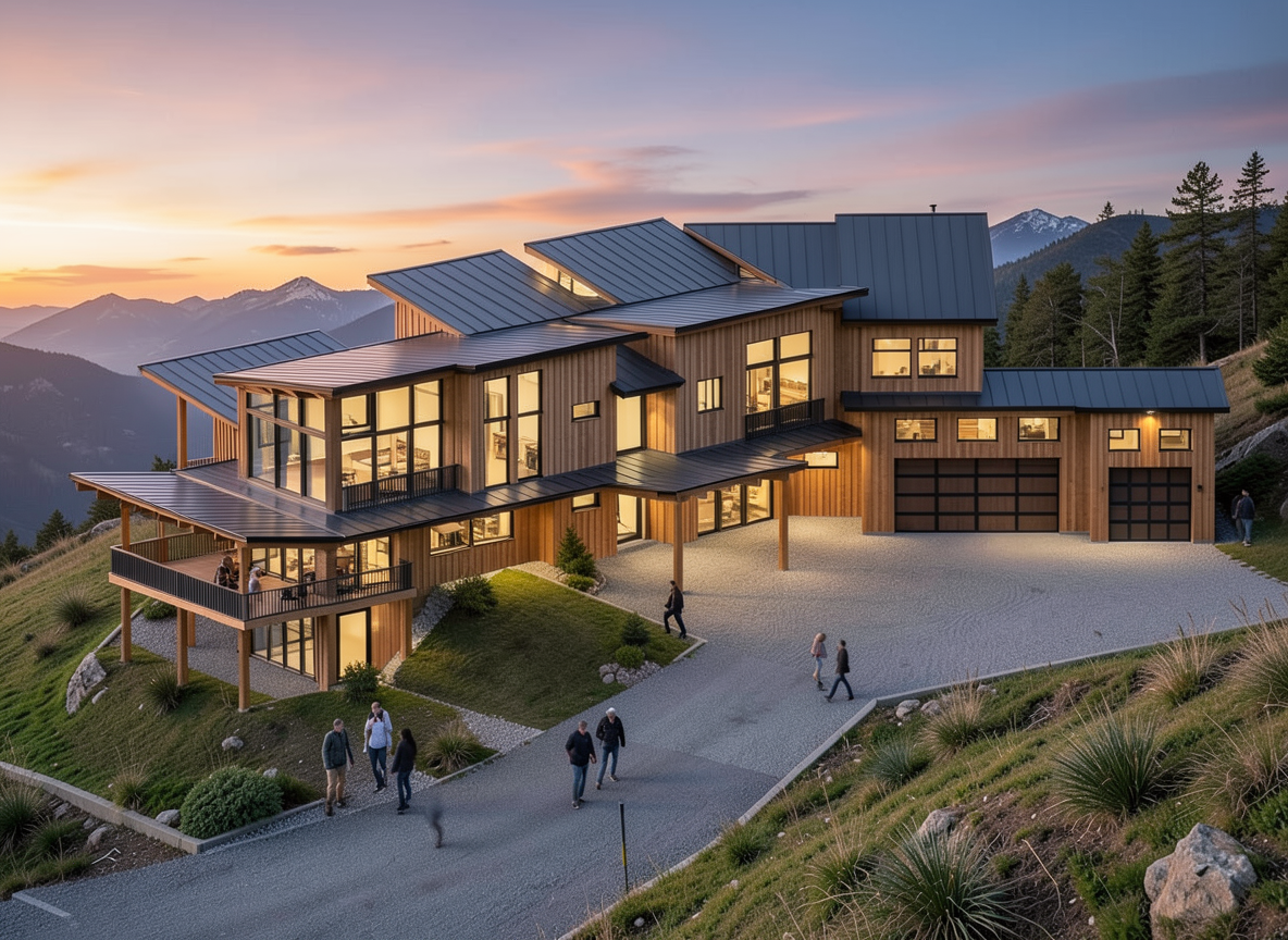 mountain modern residence with dark grey standing seam roof wood cedar vertical board and batten siding black metal window frames on a hill with a driveway leading to the garages taken at sunrise with interior lite spaces garages with glass panels no brick facades all cedar wood board and batten add a few people in the front hot air balloon in the sky and dinosaurs in the driveway