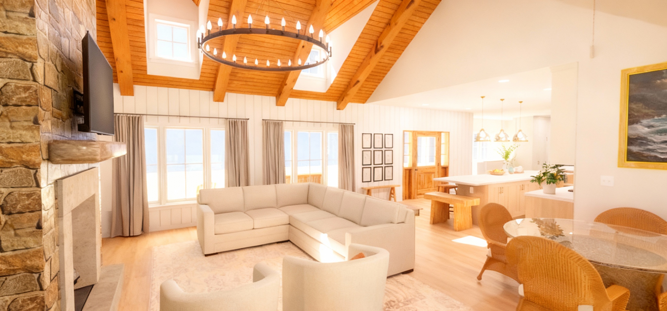 flat ceiling woven pendants above kitchen island beige small stone terrazzo floor