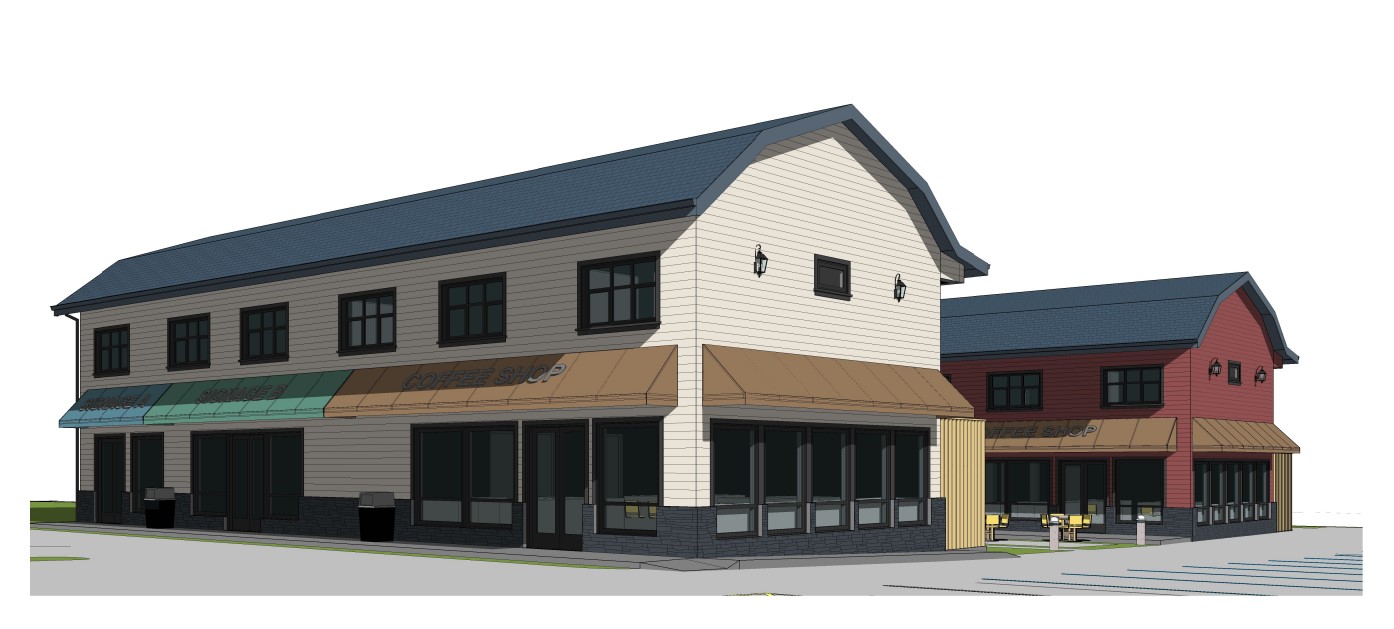 modernist exterior shot these are two barn style craftsman buildings they are mixed use buildings with commercial at the bottom and residential on the second floor make the commercial area look busy and productive like a bakery between the buildings is a courtyard seating space with some tables and add some people enjoying seattle setting with lush trees on a cloudy sunny day add some landscaping and trees around the parking lot that suite this style of architecture and region architecture