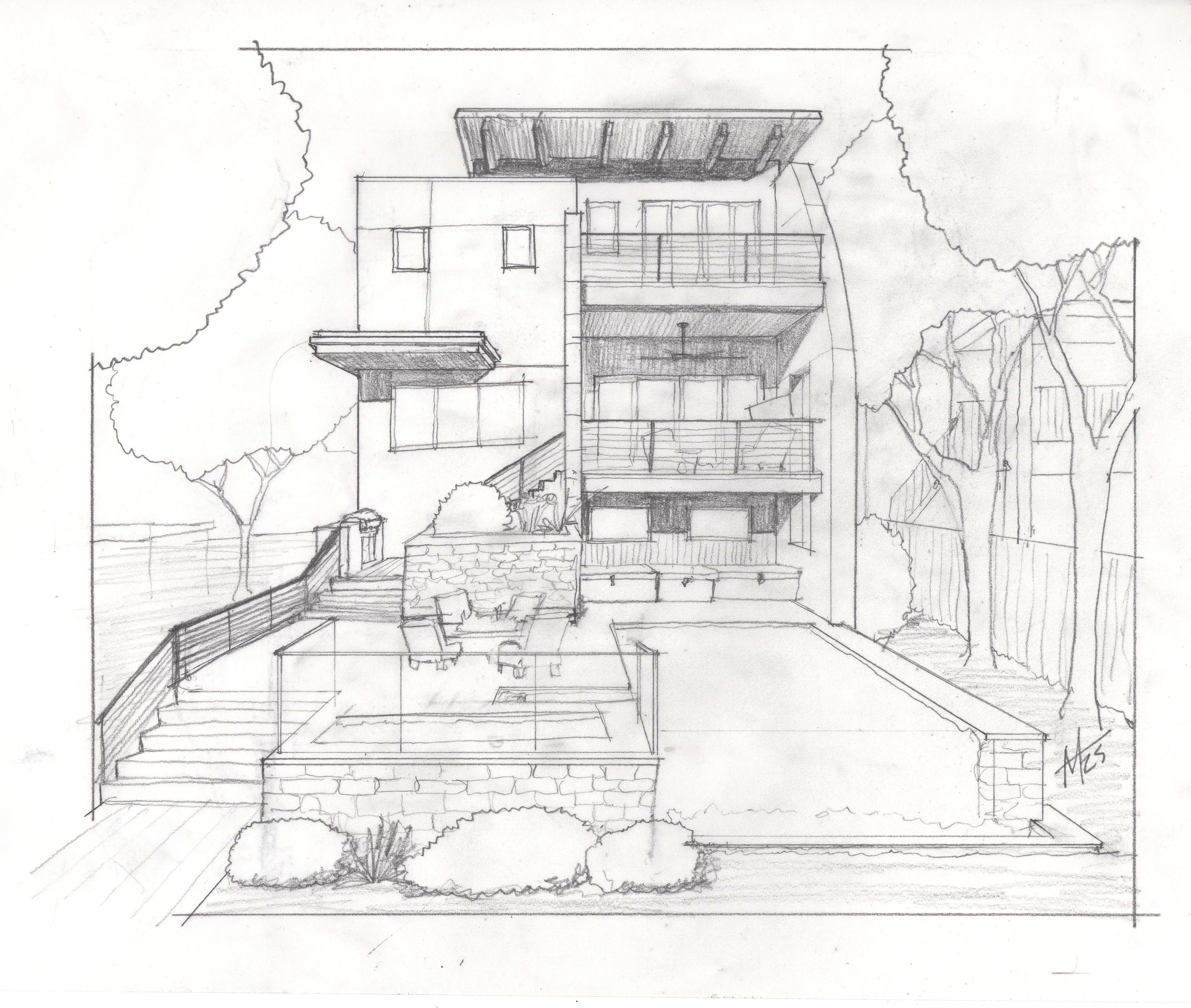 white stucco stone and dark vertilcle wood siding modern house with pool outdoor grill firepit and hot tub show at golden hour
