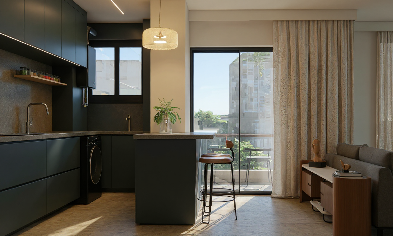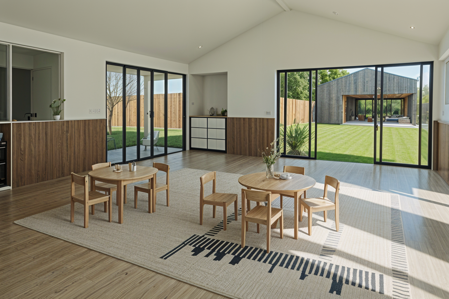 keep the same architecture and composition but create a bright summer atmosphere add warm sunlight clear blue sky make the lighting soft and natural with gentle shadows remove all cars from the image keep everything else realistic and harmonious make the tree look like it s in full summer foliage