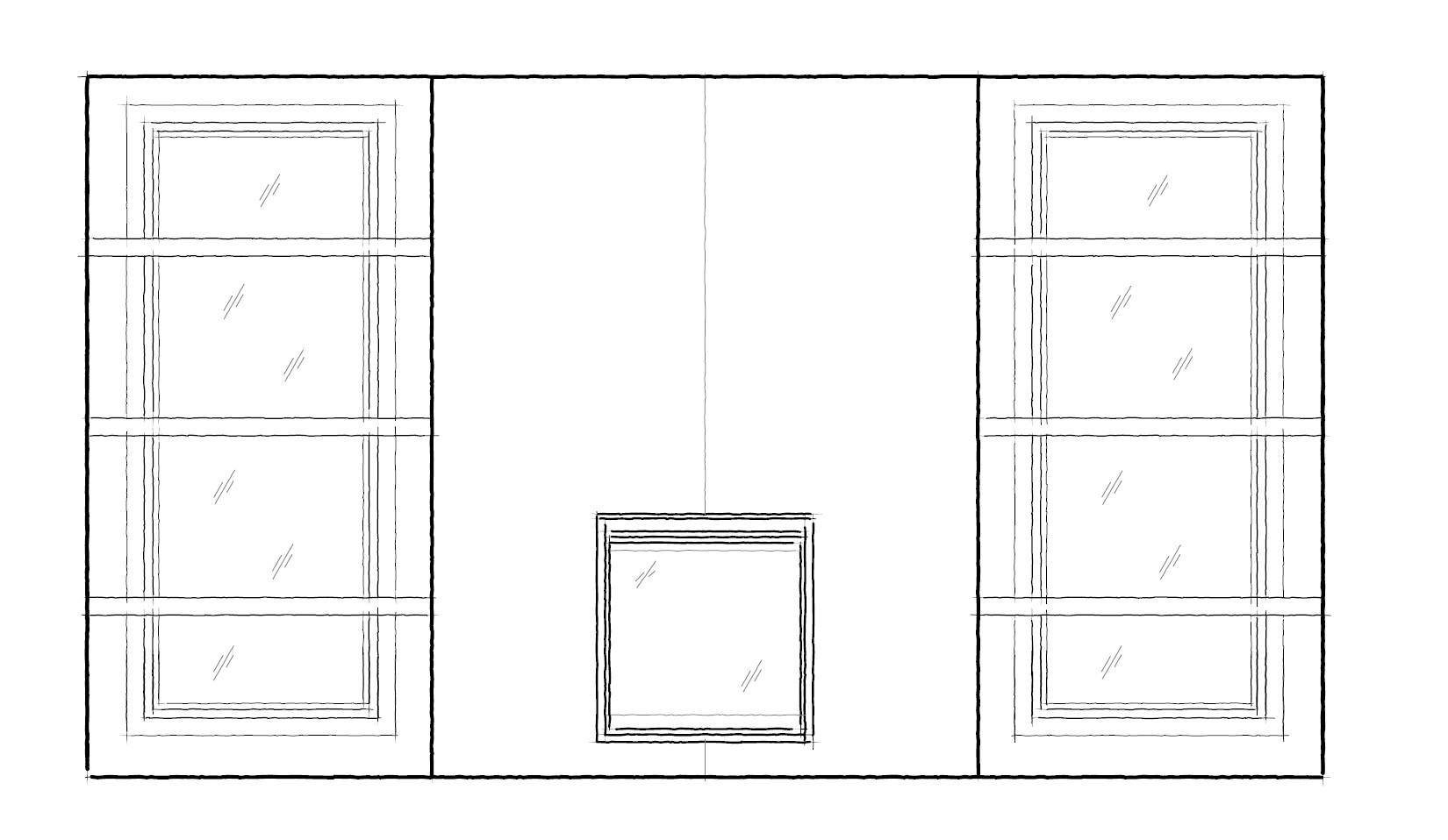 design built in wood shelving flanking a central fireplace wall in a bright great room the shelving units are positioned directly in front of tall windows so maintain a light airy feel avoid heavy or bulky styling use warm natural wood tones white oak or light walnut with a refined modern profile and minimal trim incorporate clean lined horizontal shelves with subtle vertical divisions keeping sightlines open to allow natural light to pass through from the windows behind styling should be balanced and curated a mix of neutral toned books matte ceramics small sculptural objects and minimal greenery avoid clutter the center fireplace chase should be the focal point clad in bold porcelain stone with dramatic veining large scale high contrast the shelving should complement not compete with the fireplace keep finishes soft and understated to contrast the bold stone add integrated warm led shelf lighting for a soft glow in the evening overall aesthetic modern organic high end residential calm and cohesive palette with layered textures and natural materials