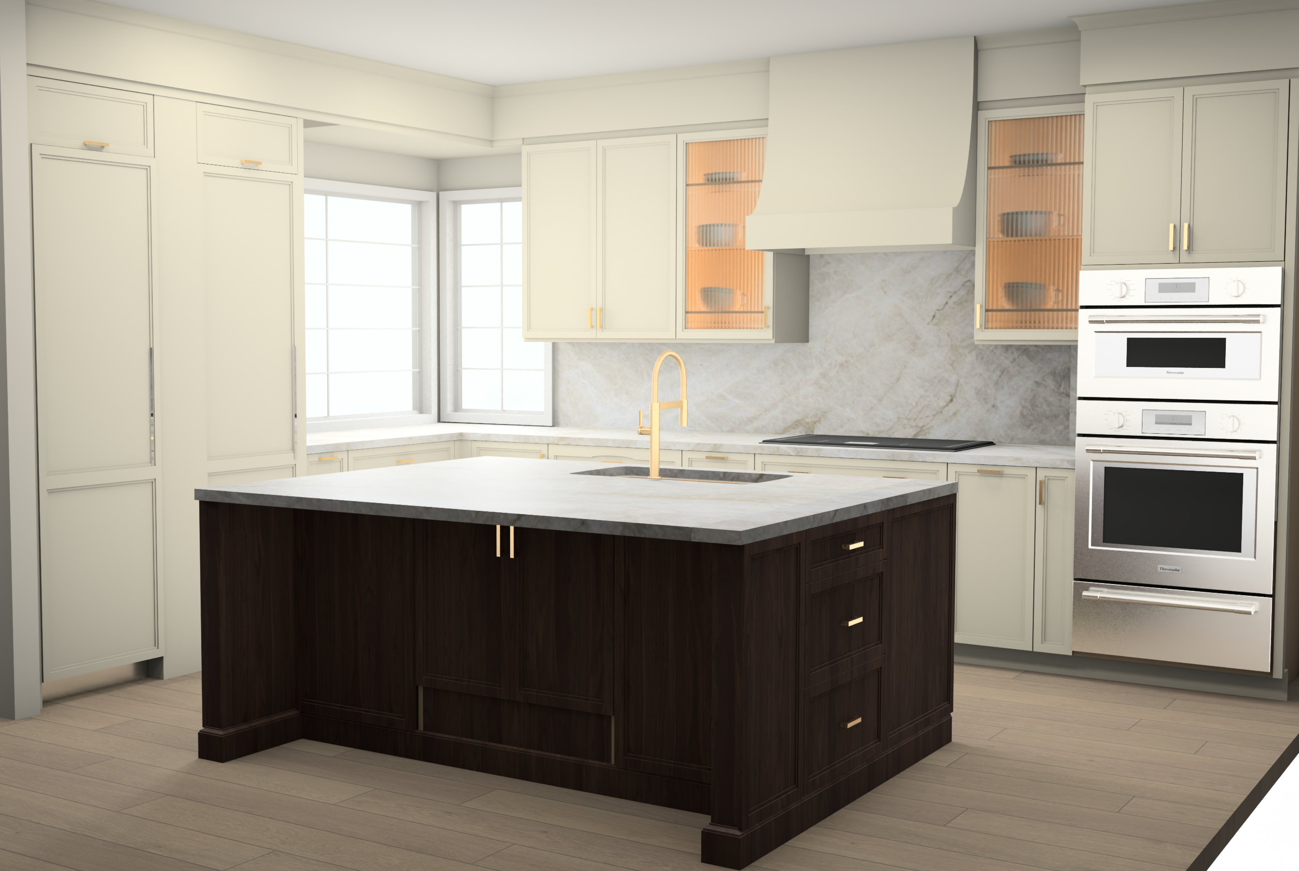 make the rendering more realistic and natural light add trees outside of windows add 3 bar stools add kitchen accessories