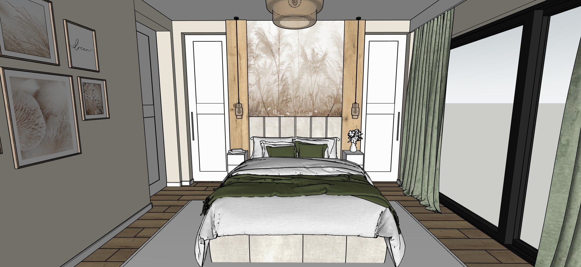 make the doors woodden the flowet wallpaper behind the bed must be little brighter and the outdoor vegetation can t be tropical
