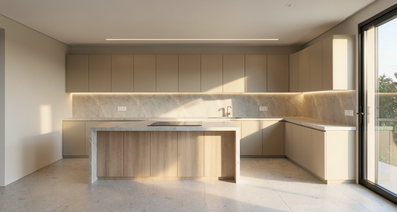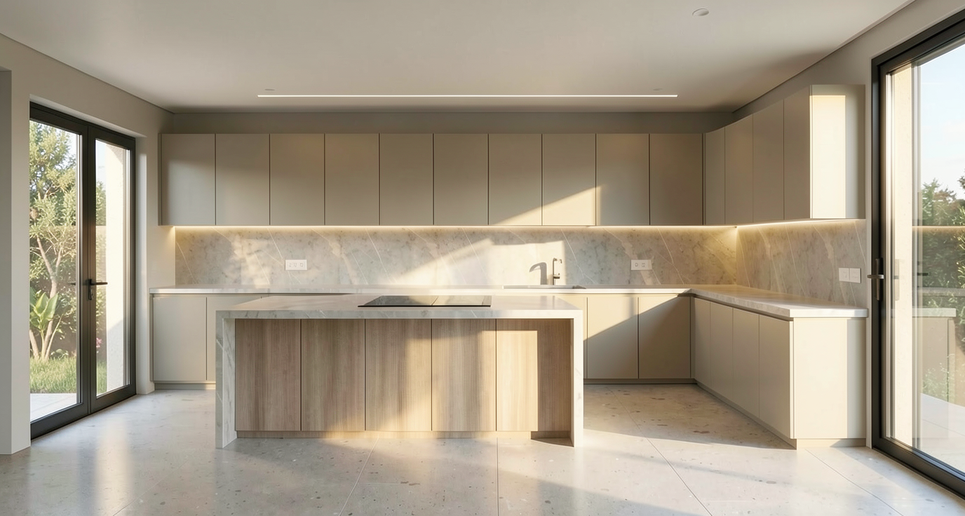 photorealistic modern minimalist kitchen interior same camera angle and composition as the reference image warm late afternoon sunlight with soft realistic shadows and global illumination matte beige flat panel handleless cabinets with clean vertical panel lines light oak wood accent on the kitchen island front marble countertop and full height marble backsplash with subtle grey veining large island with waterfall marble edges and an integrated black induction cooktop neutral light stone tile floor clean uncluttered surfaces high end architectural interior photography style ultra realistic ray traced reflections soft tone mapping 4k layout updates on the right side keep a built in tall refrigerator unit integrated into the beige cabinetry on the opposite side of the refrigerator left wall replace the large sliding door window with a single narrow vertical window only not a door the window should be approximately 60cm wide floor to ceiling height with a slim black frame from the edge of this narrow window to the back kitchen cabinets the wall must be solid no additional glass no door opening creating a clean continuous wall surface the window should provide warm natural daylight entering from the left side casting soft sun streaks and gentle shadows across the cabinets and island lighting warm led strip lighting under the upper cabinets and a subtle recessed linear led ceiling light above the island table area warm 3000k minimal modern atmosphere realistic materials and proportions
