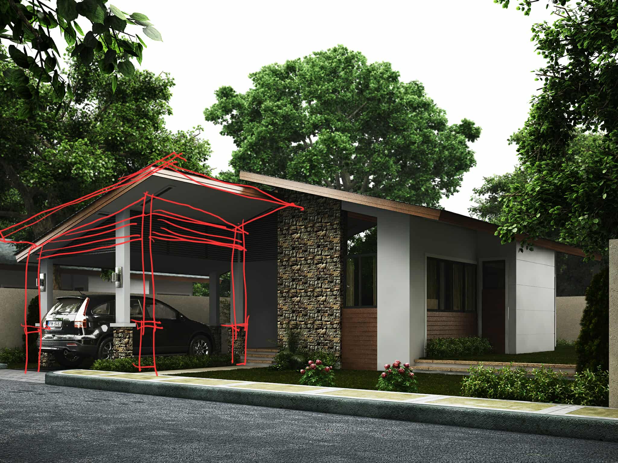 in the carport extend roof move column make it wide for two cars to park