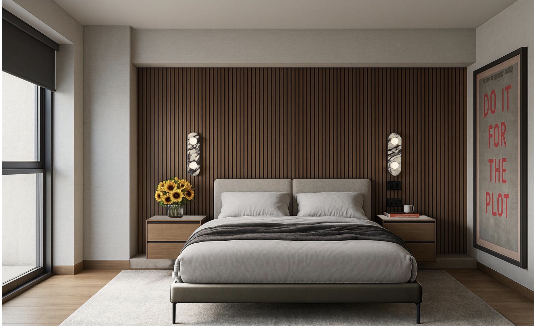remove the art piece on the left and add a circle mirror the wall panel goes all the way up to the beam