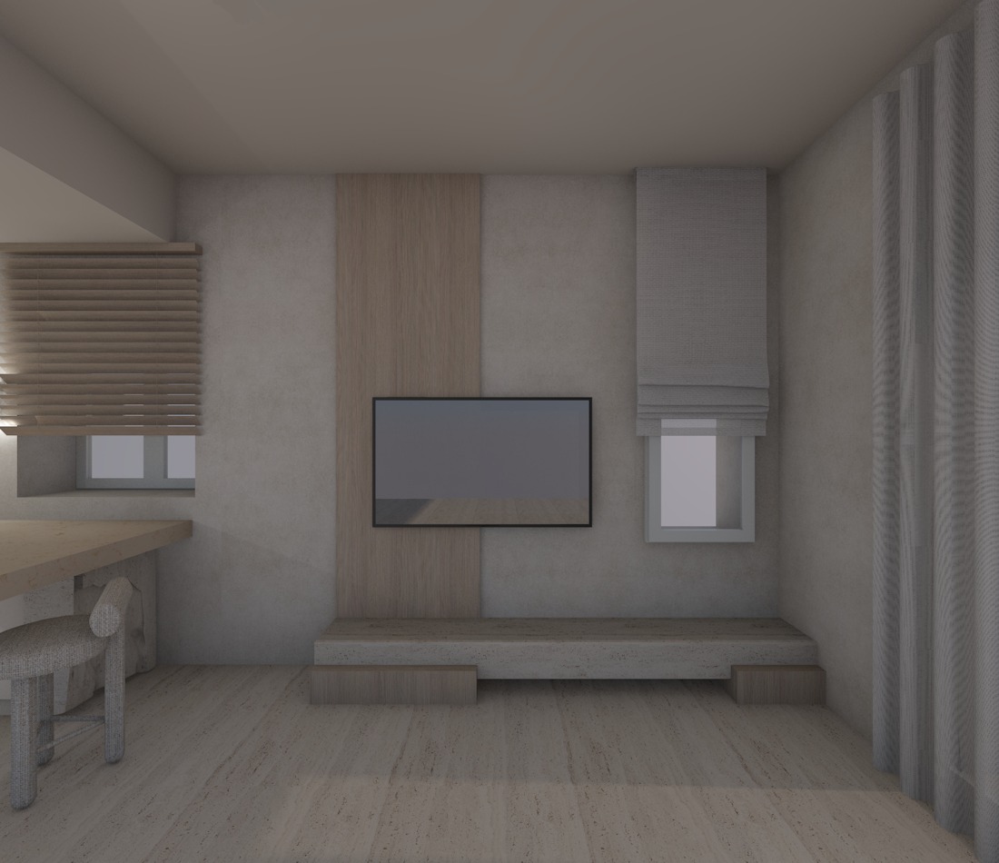 create a highly realistic render of a warm and minimal living space in a coastal home with a calm and serene atmosphere the design is inspired by seaside living combining natural materials soft tones and a relaxed yet refined aesthetic the main feature is a tv wall composed of vertical light oak wood panels creating a clean and architectural backdrop that adds warmth and natural texture a wall mounted flat screen tv is centered on the panel below the tv there is a low built in bench in the same wood finish extending horizontally and blending seamlessly with the wall composition on both sides of the central panel the wall is finished in light beige microcement maintaining a soft and sandy tone palette inspired by coastal environments there are two windows with roman shades in natural linen fabric in soft beige tones the fabric gently diffuses the daylight enhancing the airy and relaxed feeling of a seaside home natural light enters through the windows creating soft elongated shadows across the floor reinforcing the sense of calm and openness on the left side part of the kitchen island is visible along with bar stools featuring light oak wooden legs and light beige linen upholstery maintaining material continuity throughout the space on the right side full height curtains in off white linen fabric add softness and movement enhancing the breezy coastal character the flooring is in a light natural stone tone contributing to the overall serene and cohesive atmosphere the overall lighting is soft natural and diffused creating a warm inviting and elegant coastal ambiance ultra realistic render high resolution premium materials coastal interior design interior design magazine photography style travertino bench