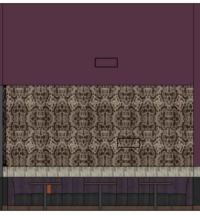 recreate this elevation of a restaurant booth into a photorealistic elevation the atmosphere should be moody with warm strip downlighting and shadowing the wallpaper and other materials should be maintained