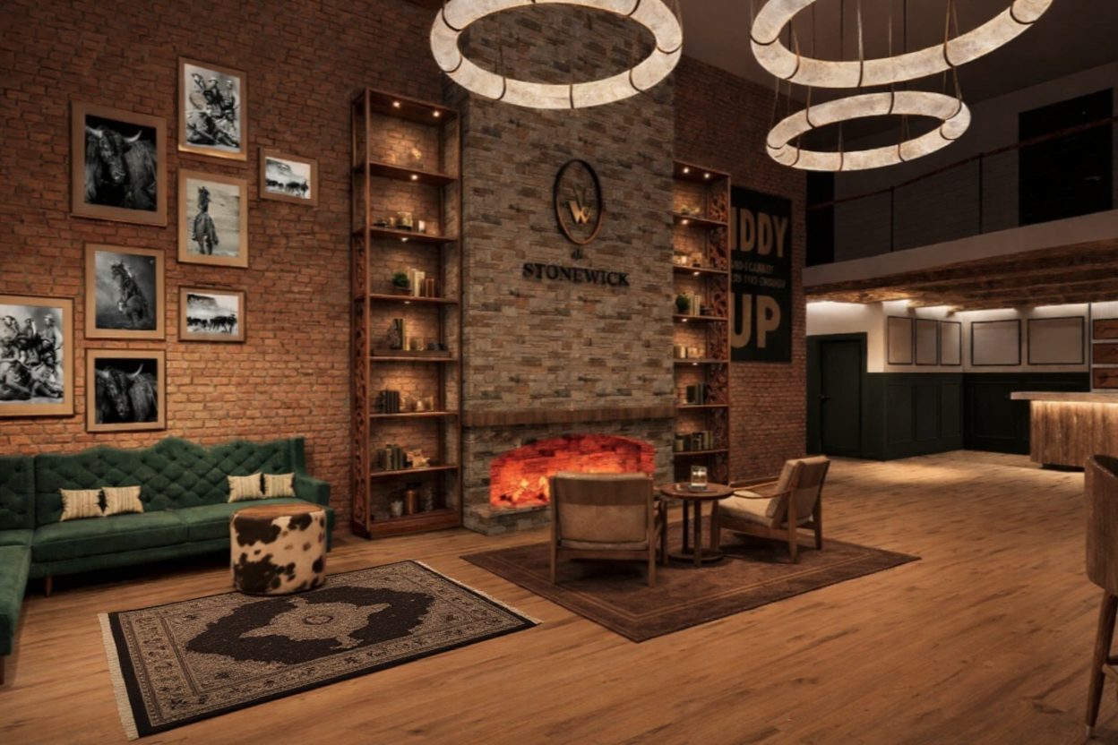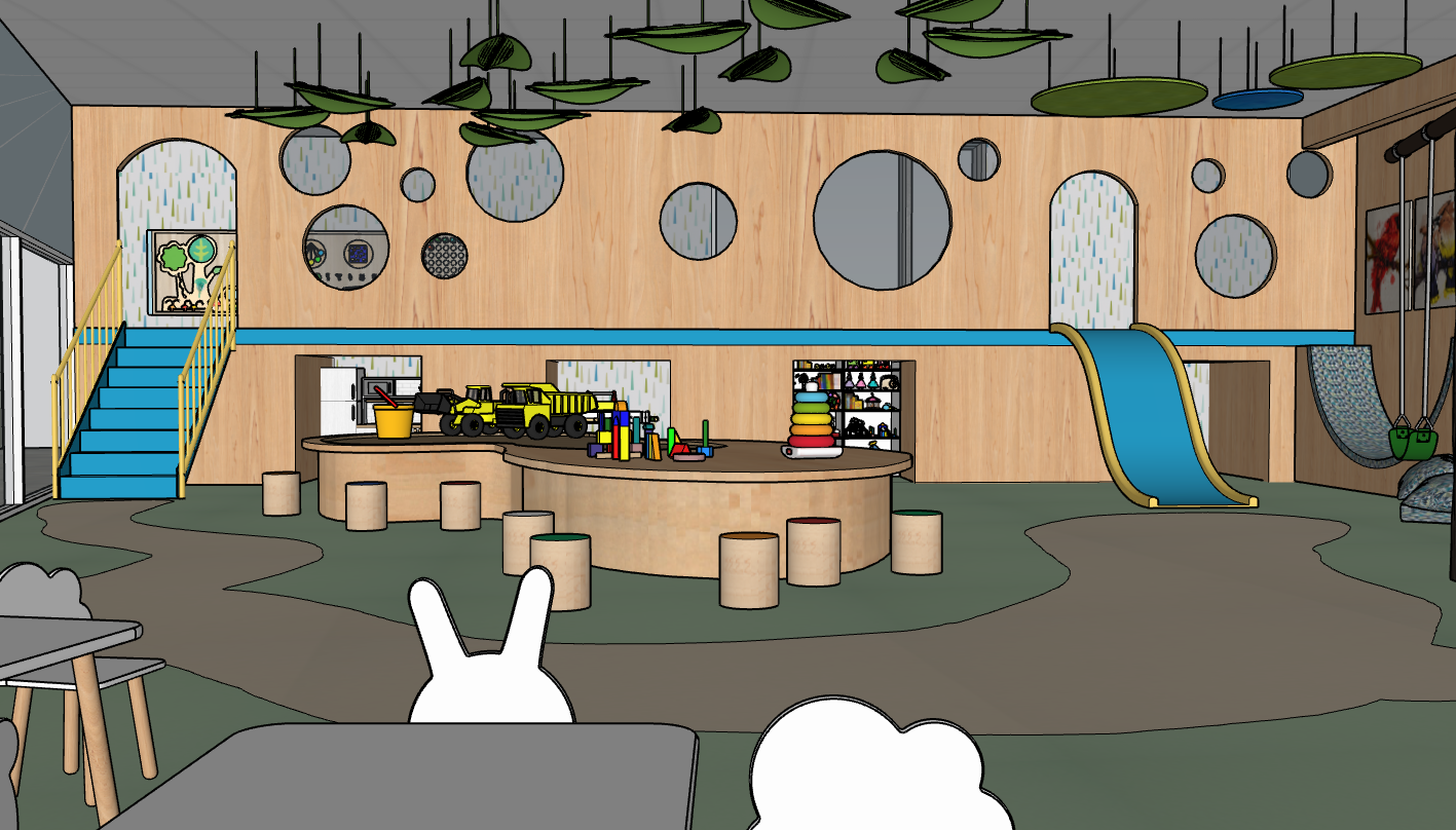 create a photorealistic rendering of this indoor childrens play space make the ambience slightly warm the natural light would be coming from the right side of the image and would not be too bright add recessed lights to the ceiling do not lose the colours of the materials do not remove or add more furniture the back wall is straight do not change the shape of the windows do not add plants or windows