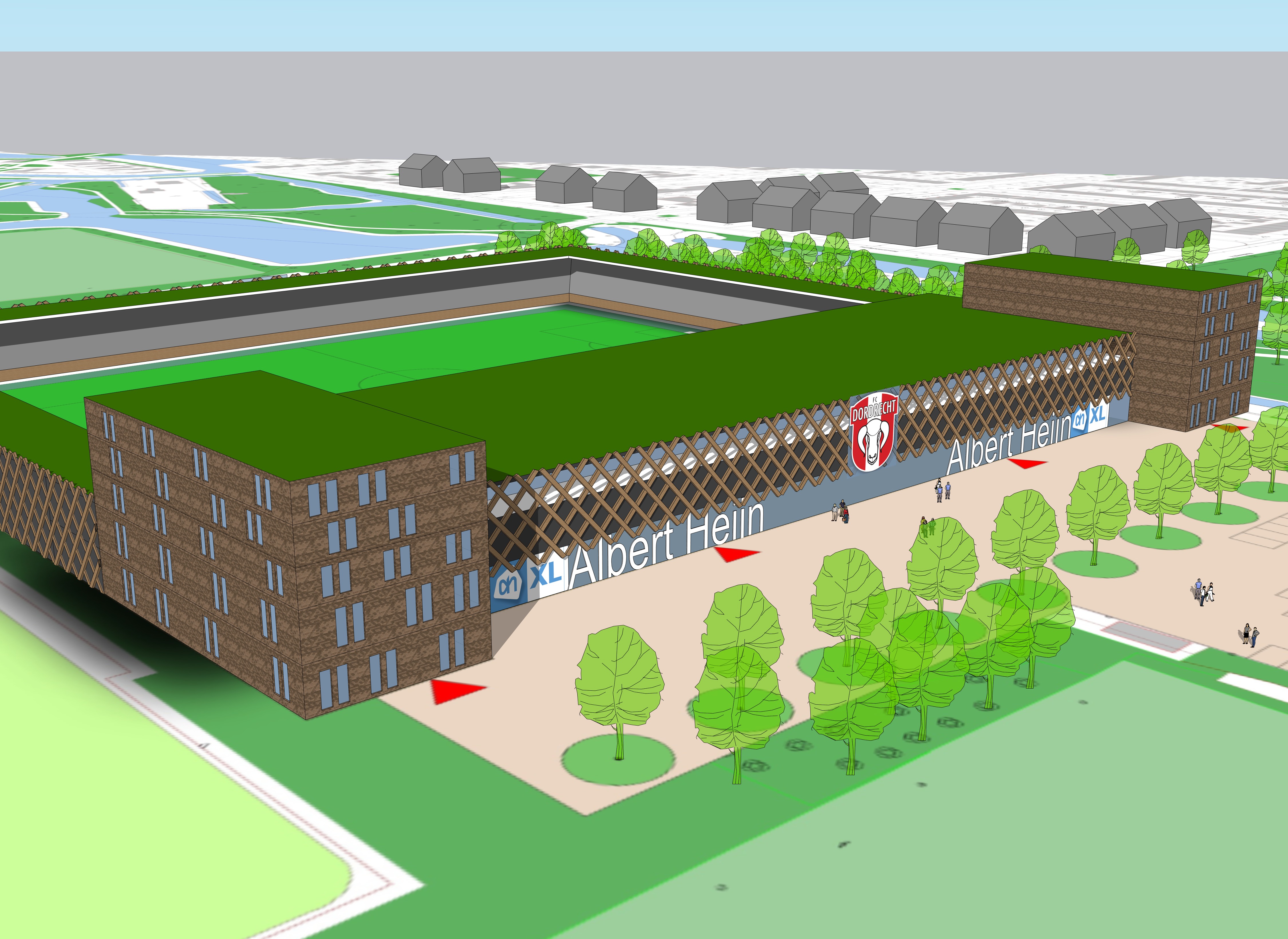 add a lot of people playing soccer on the soccer fields add some cars in the parking lot add trees add people on the tribunes in the stadium