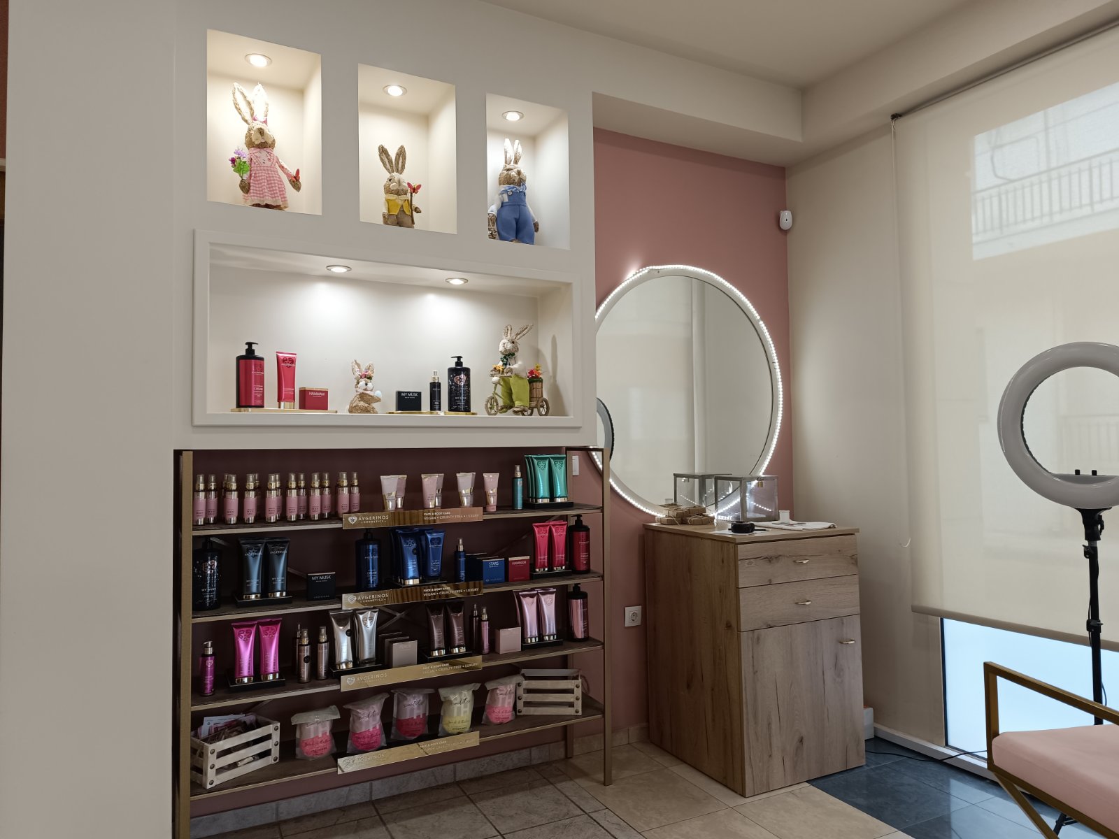 modernist exterior shot replace the wooden cabinet under the round mirror with a minimal same pink color with the wall built in cabinet that is in length from the wall to the other library shelv it has one drawer at the top and three cabinets under the drawer clean flat panels with vertical shadow gaps instead of handles keep exact proportions and perspective same lighting conditions photorealistic no other changes architecture