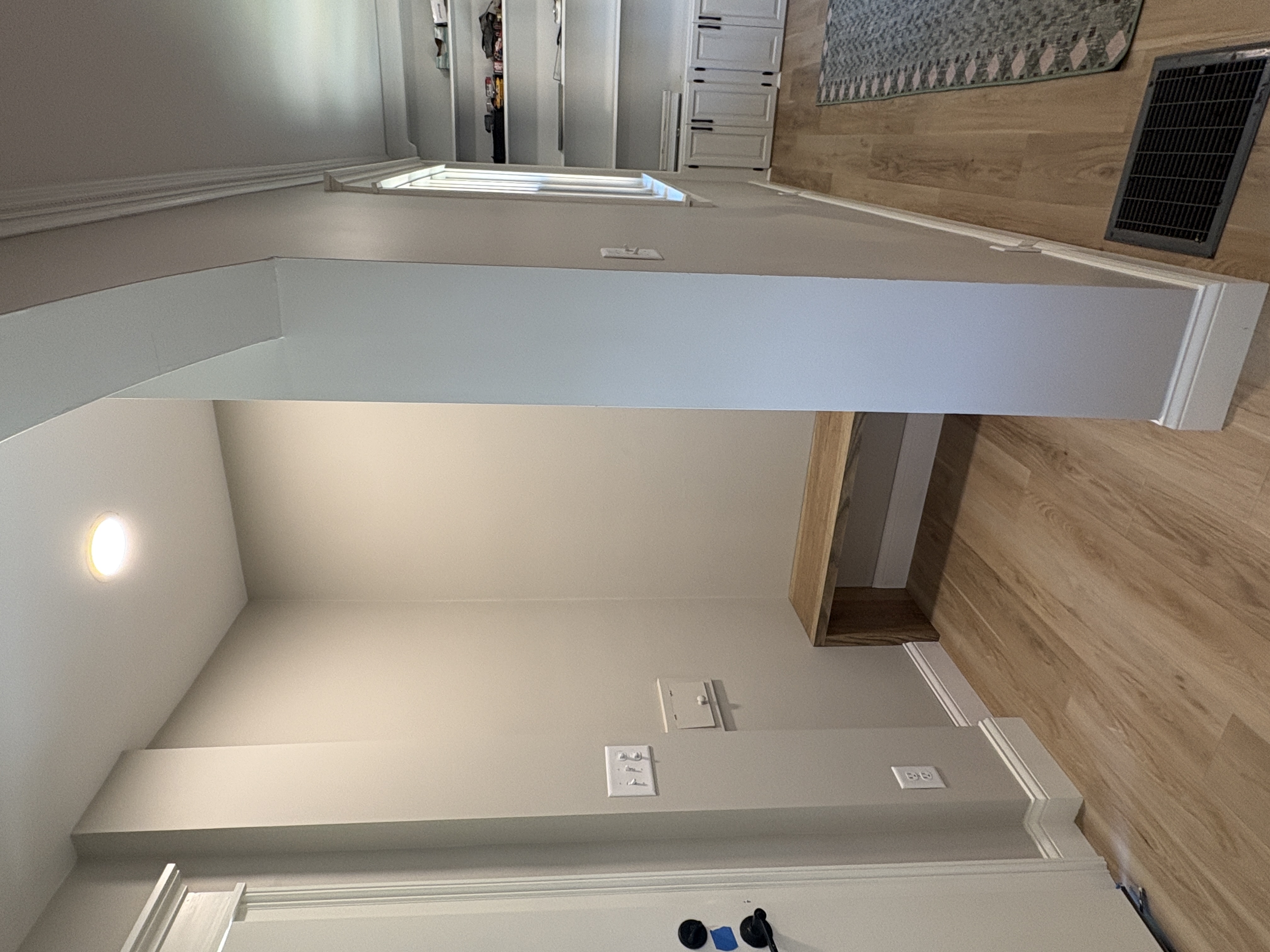add simple board and batten trim and three hooks at back wall above the bench with one hook on left wall above bench paint board and batten white to match the trim and add a wooden shelf above hooks