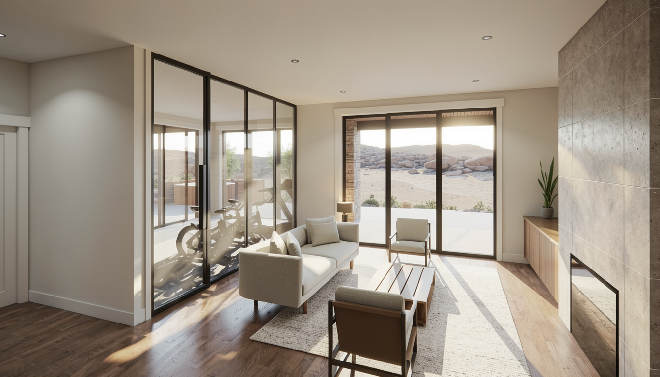 make rendering late afternoon with golden yellow light coming from interior through all windows