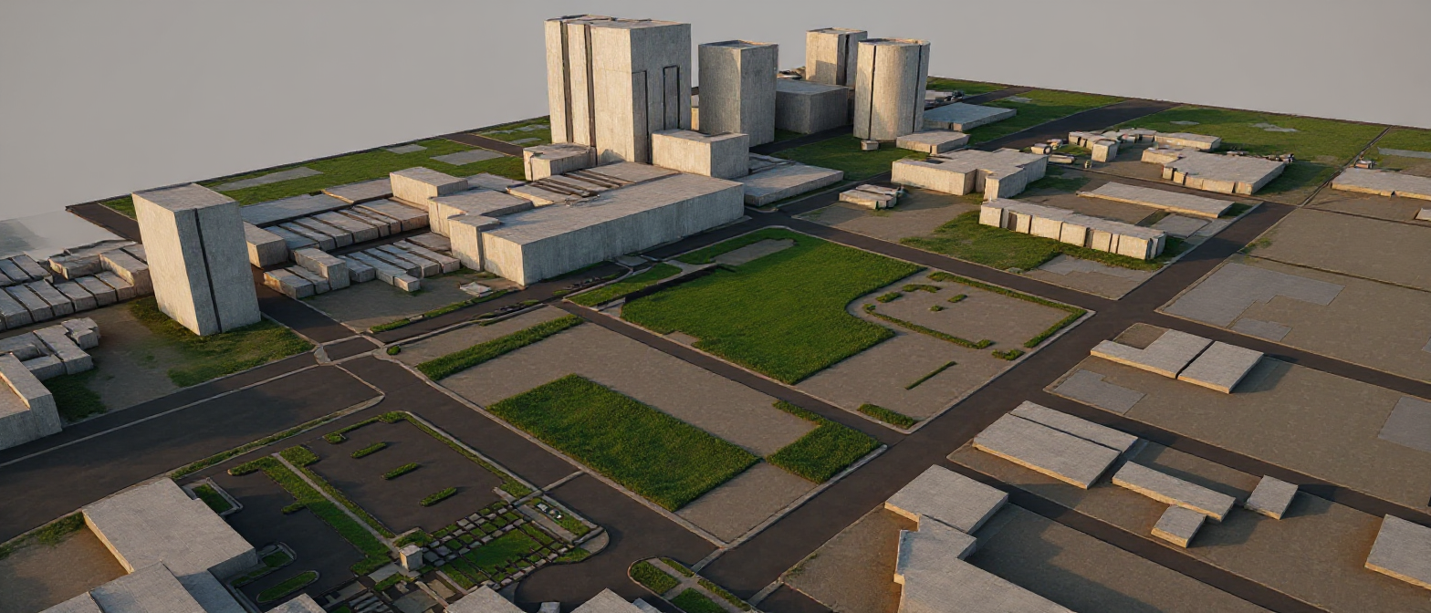 a soft architectural illustration style with clean simplified forms buildings and objects are outlined with thin smooth linework surfaces use flat colors with gentle tonal gradients to show depth no harsh shadows colors are bright slightly pastel giving the scene a friendly cartoon like feel details are minimal but crisp with subtle highlights and soft shading around edges trees and vegetation are rendered as simple shapes with blended gradients rather than textures the overall look is light airy and stylized similar to a polished conceptual cartoon or children s book illustration not realistic
