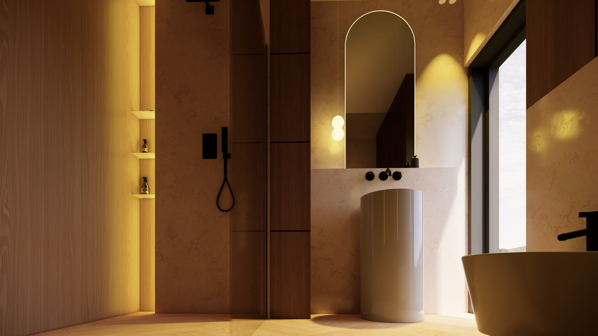 add brightness and realism keep the same structure and colors add another exterior background a yard and place a minimalist black horizontal blind on the window