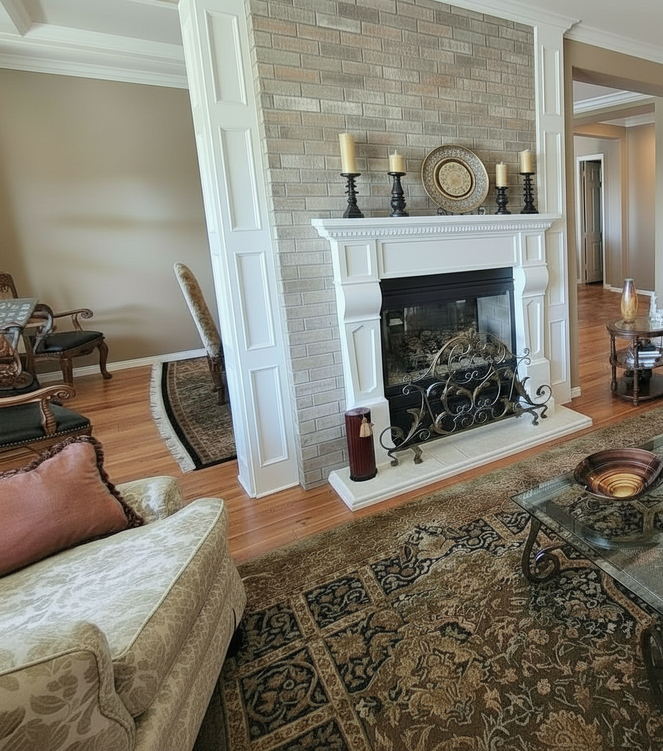 widen recessed wall panels on right of fireplace to cover painted wall around doorway maintain same colors textures and furniture