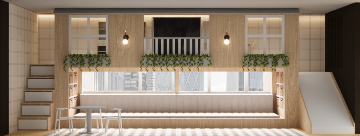 add cusions all over the couch a cozy atmosphere add a little girl reading while she is sitting on the couch fill the scene with volumetric light