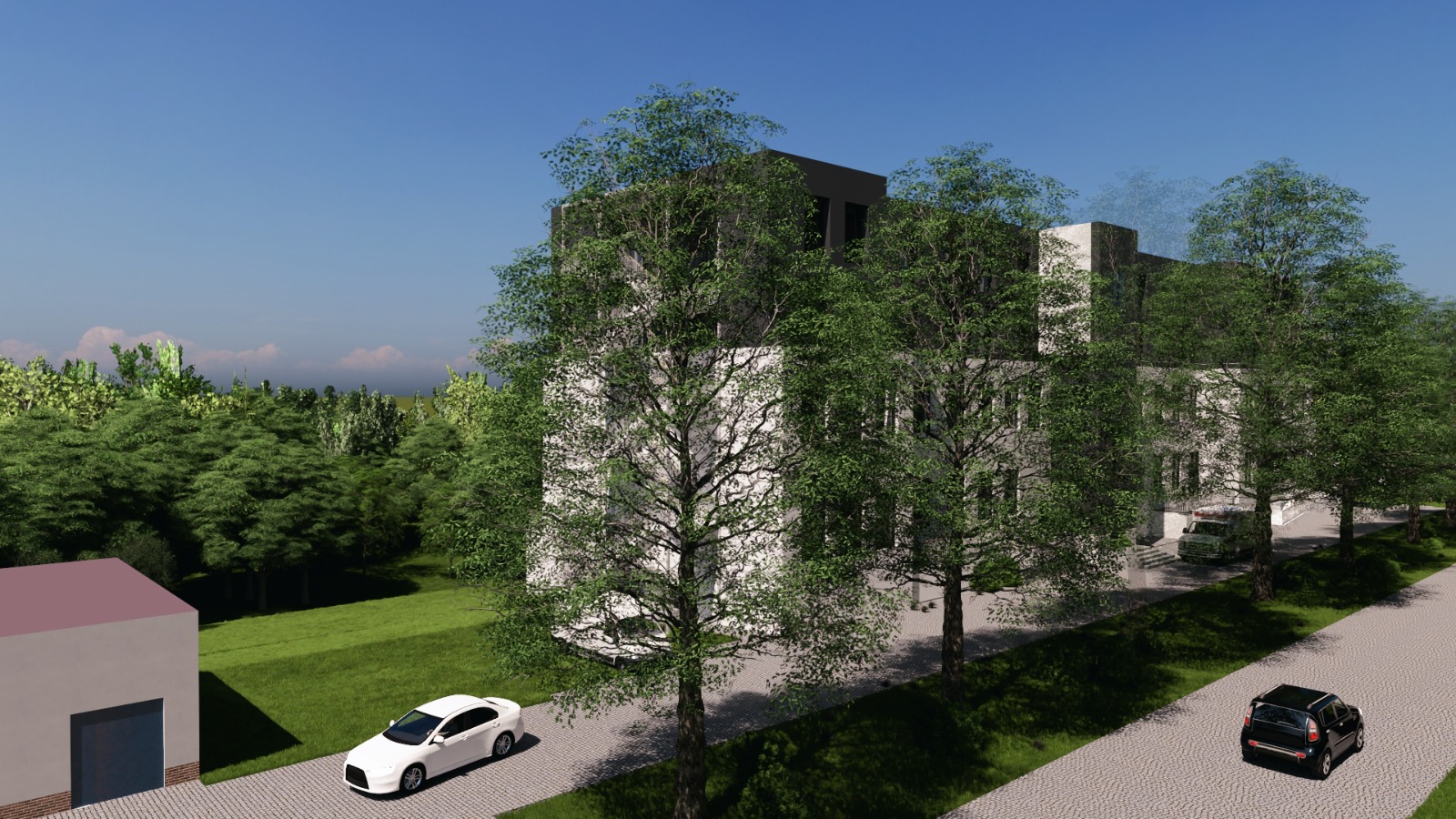 nicholas grimshaw exterior shot add interiors to windows add street lamps add garden furniture for disabled add people silhouettes architecture