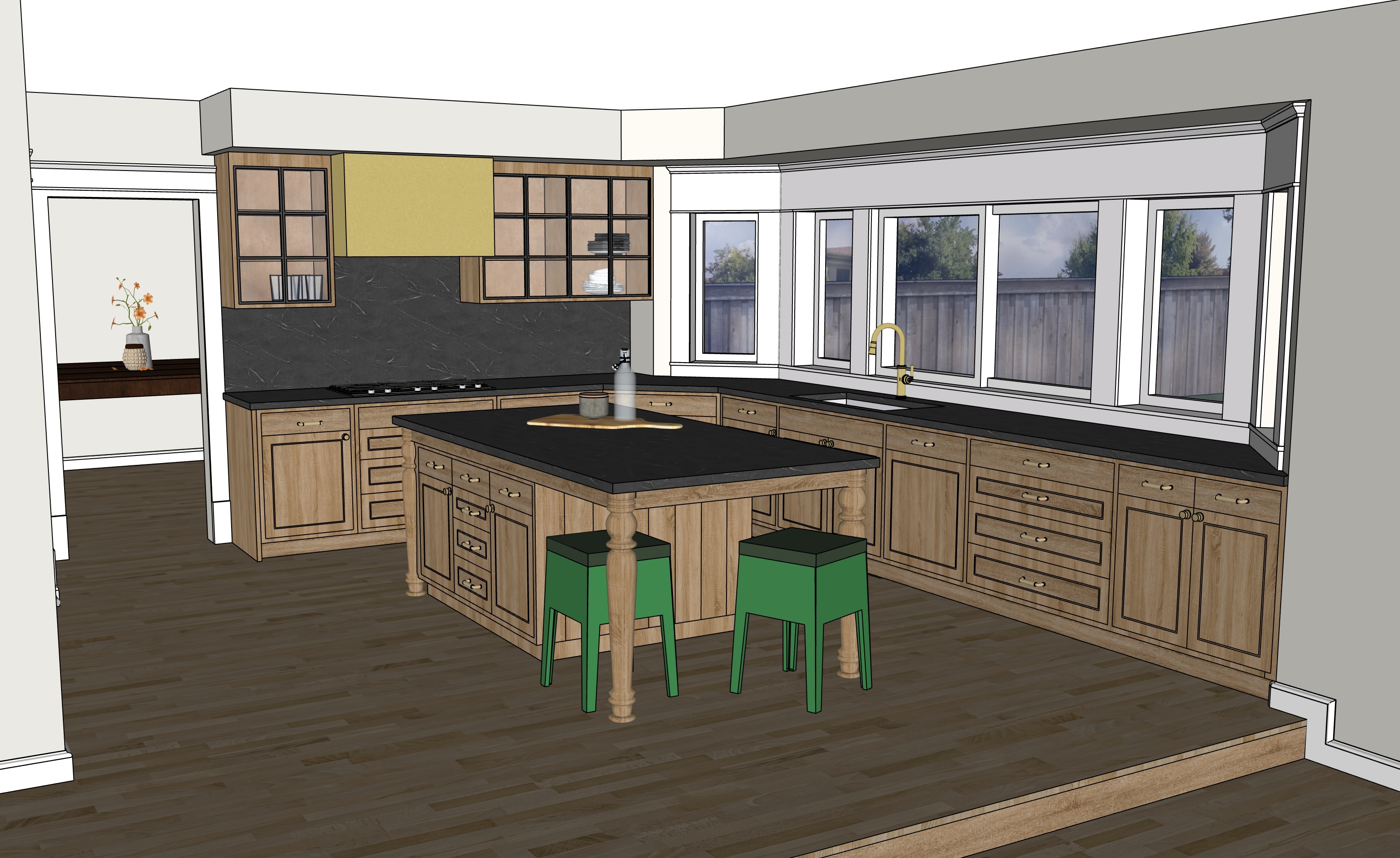 render this image as photo realisitic do not add anything to the room do not put anything in the cabinets the floors and countertops should be matte the range hood cabinet handles and faucet should have a rich brushed brass finish the upper cabinet doors left and right of the range hood should have black steel frames give the room warm natural light do not add any light switches