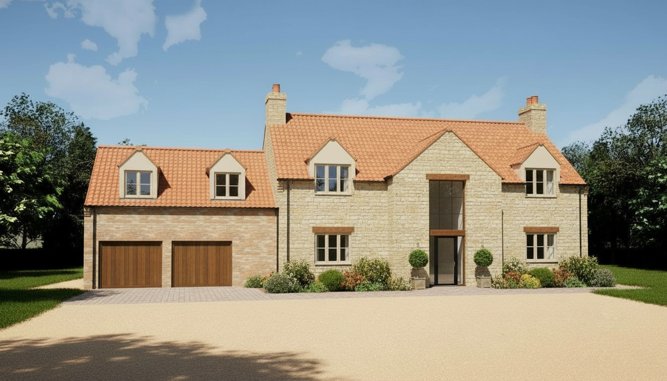 exterior shot keep the building shape and roof design and window and door sizes and positions the same as the source image and all walls to be finished with stone
