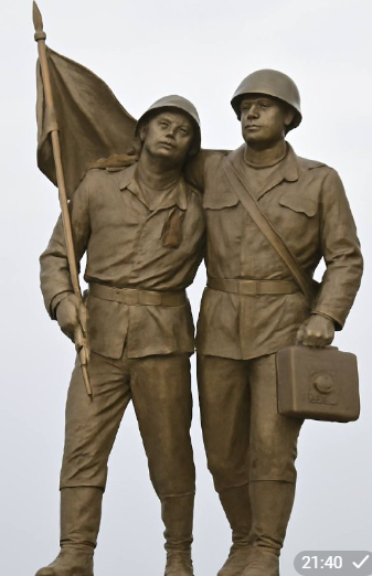 nordic exterior shot statue of two soldiers made of plastic futurism in white red and blue colors russian architecture