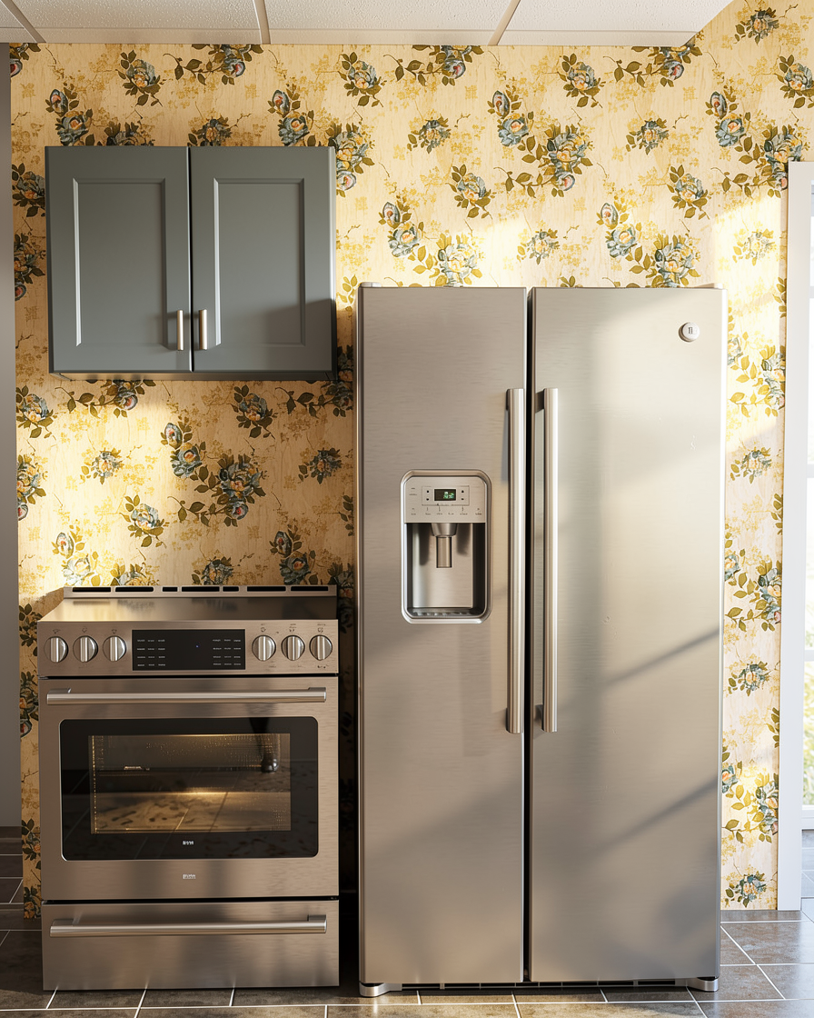 these a paneled refrigerators the hardware is brushed brass the paint color is white dove