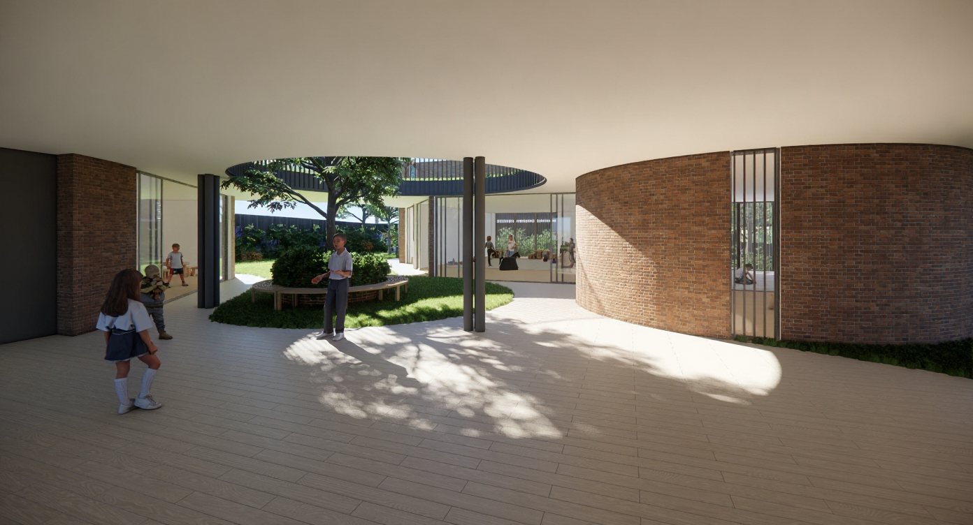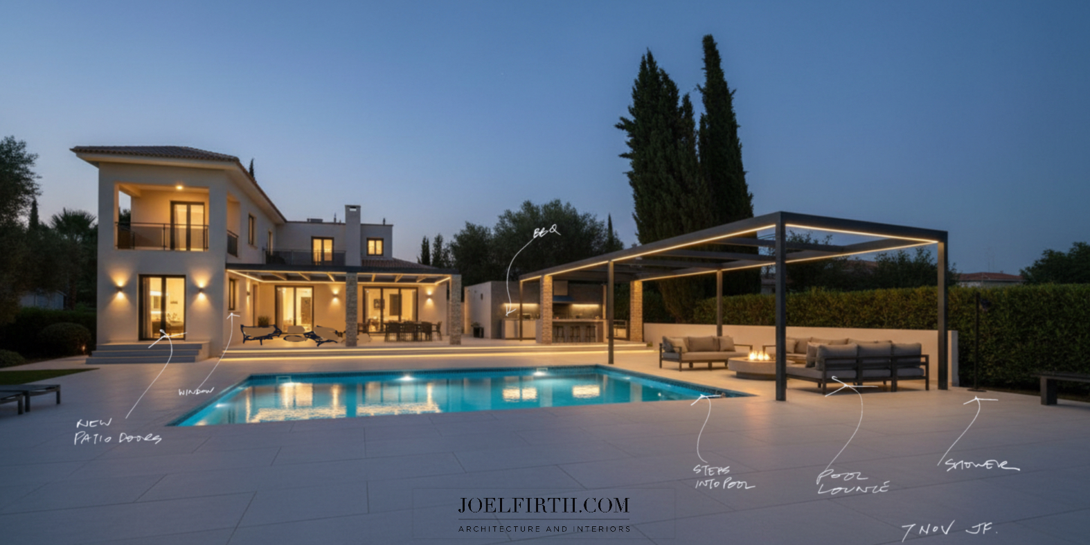 modern pool area with pergolas and led lighting large format tiles comfy sofas around pool outdoor kitchen to rear wall lights on in house and in pool external lounge on left patio under pergola