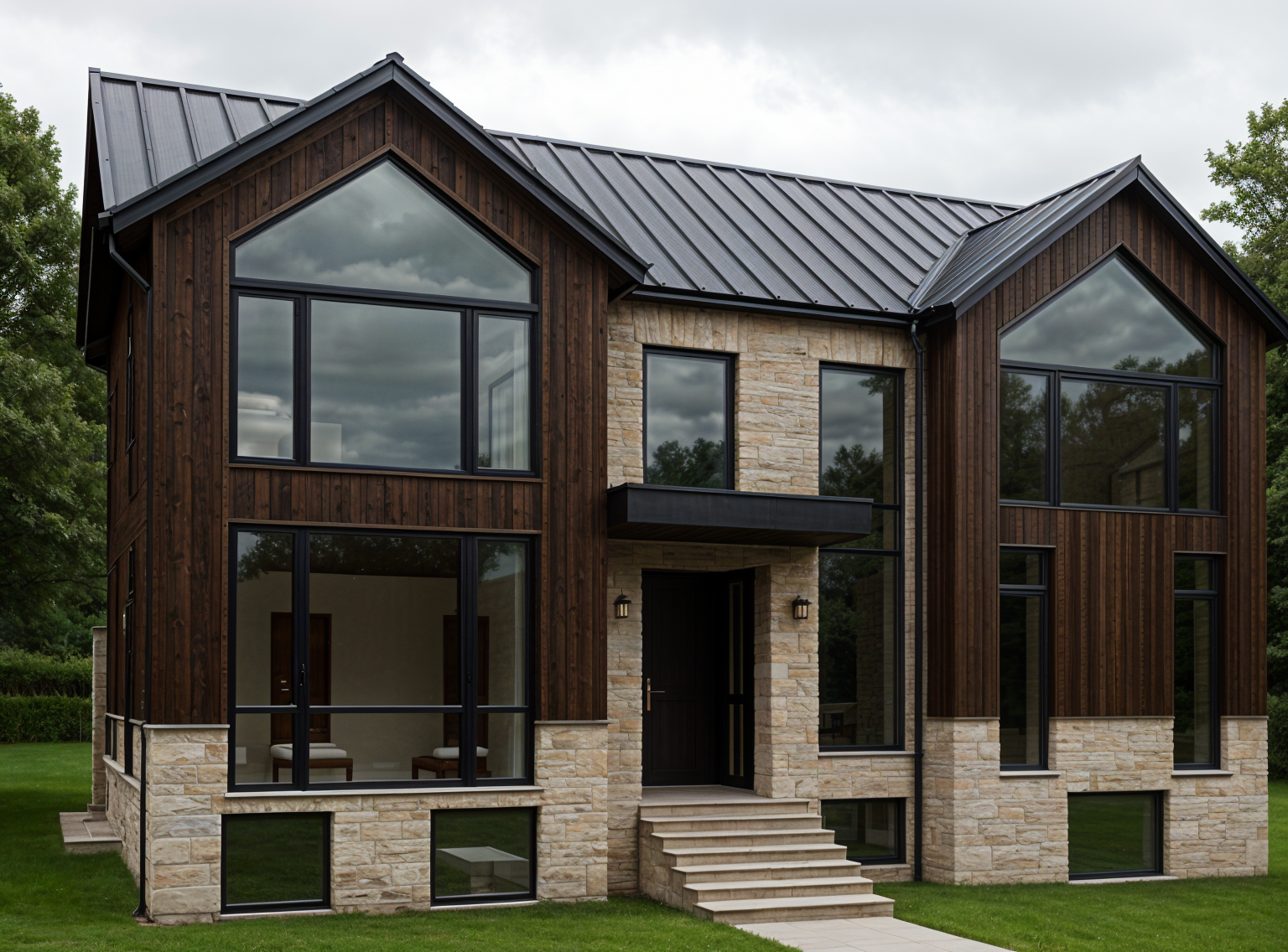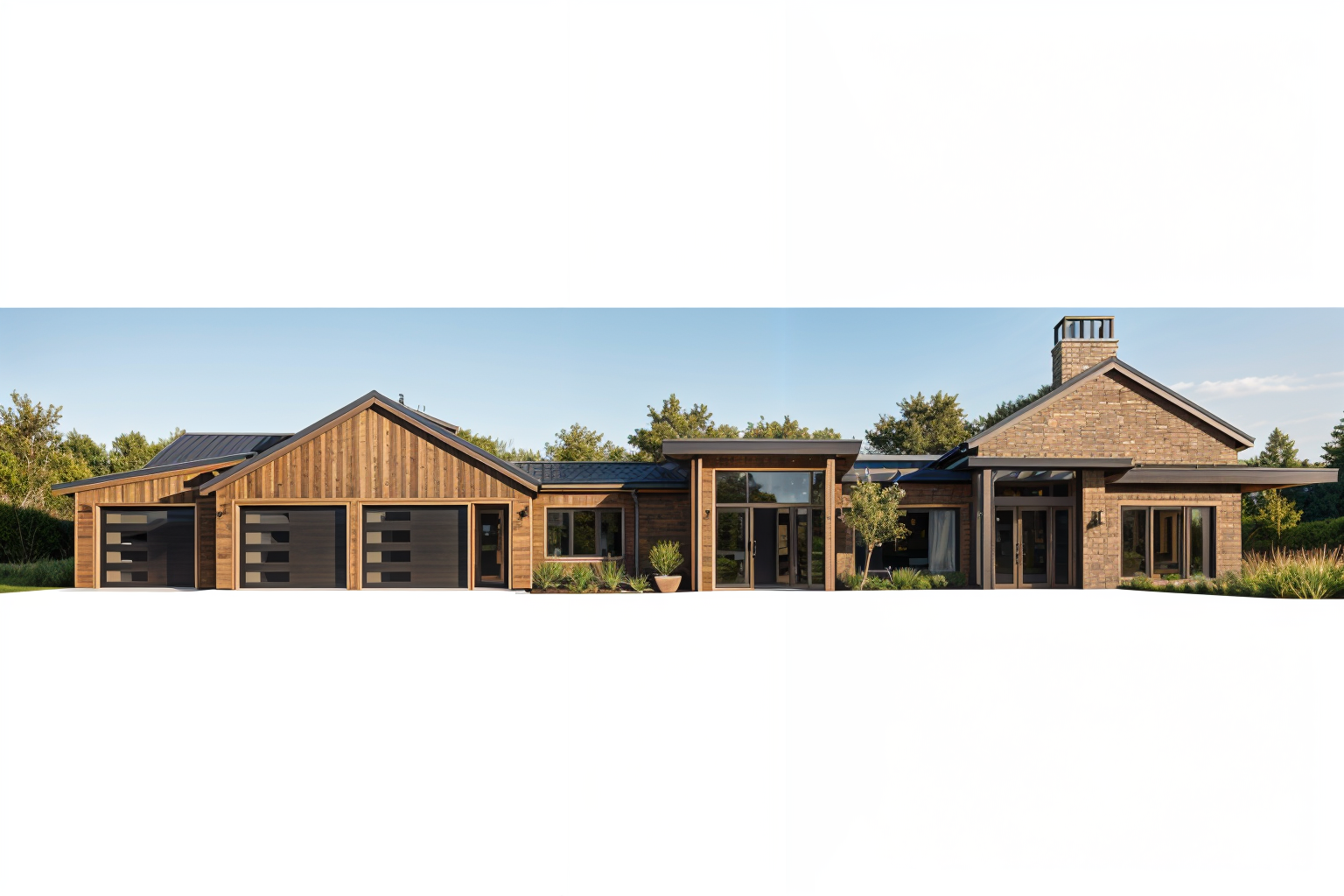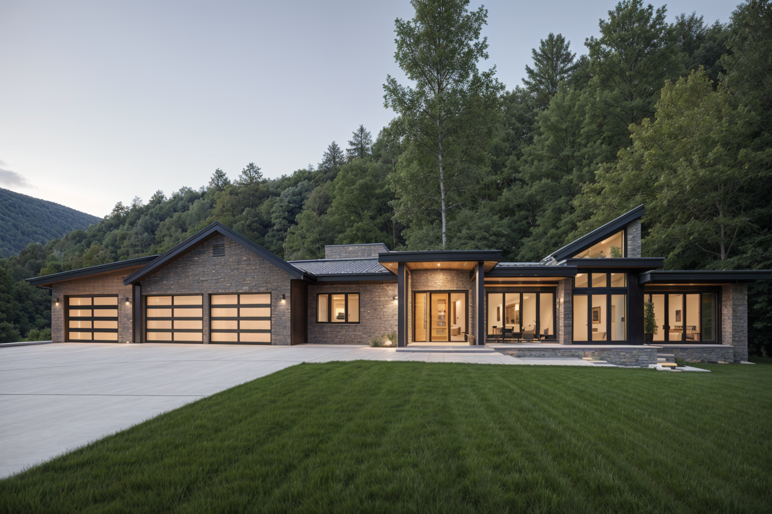 sustainable design exterior shot make the garage stone veneer with black doors with glass windows in them architecture