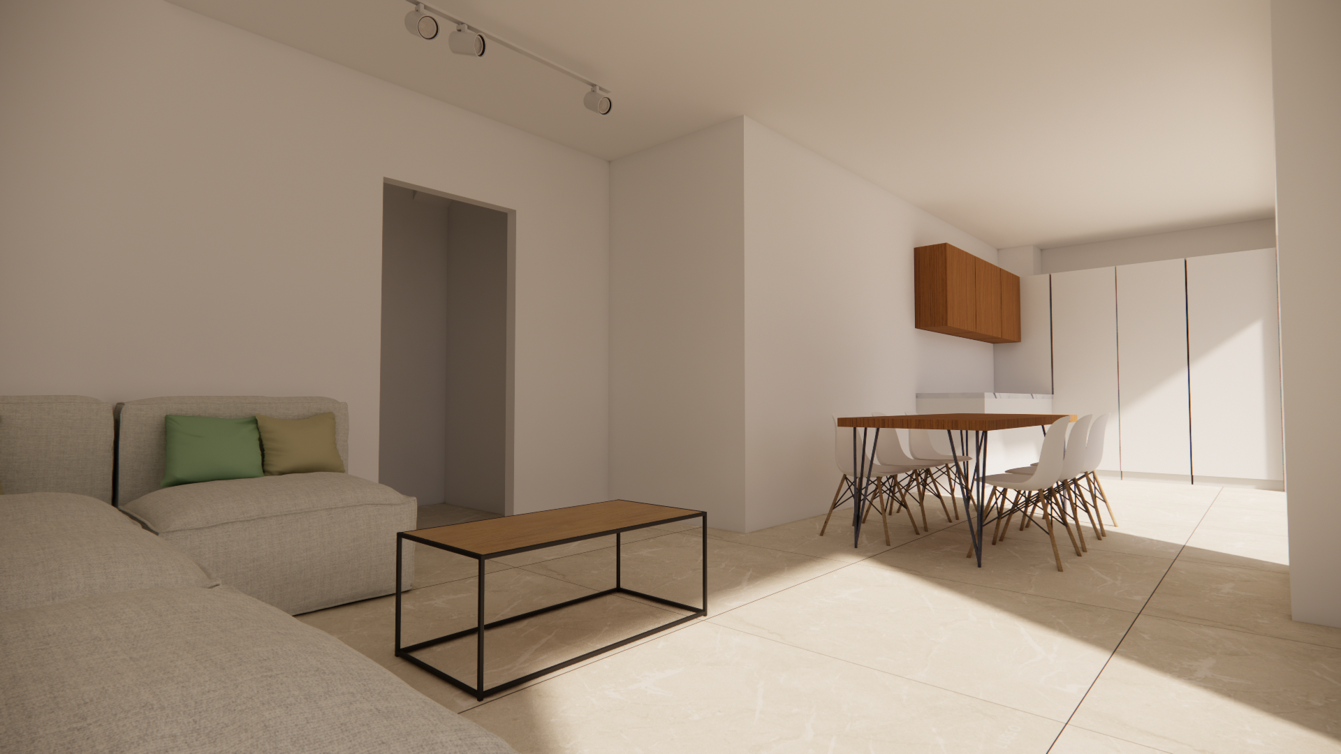 modern flat inviting comfy sofa dining area and modern kitchen hidden lights in false ceiling