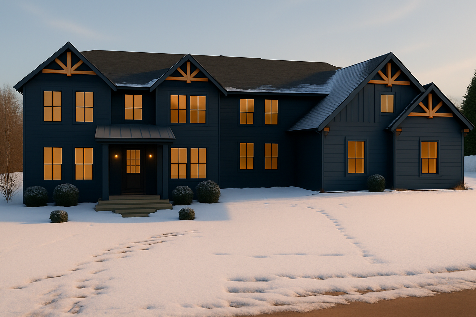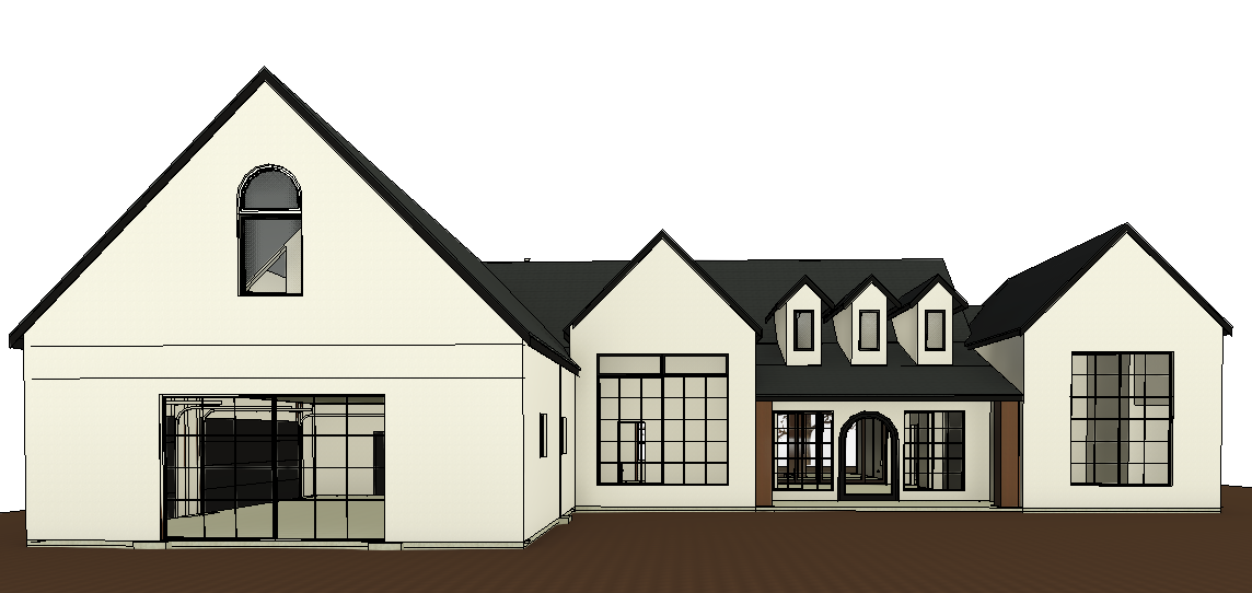 white stucco home with dark tile roof with almost dark blue tint windows with black trim and divided light mullions dark wood columns modern vintage chateau vibes