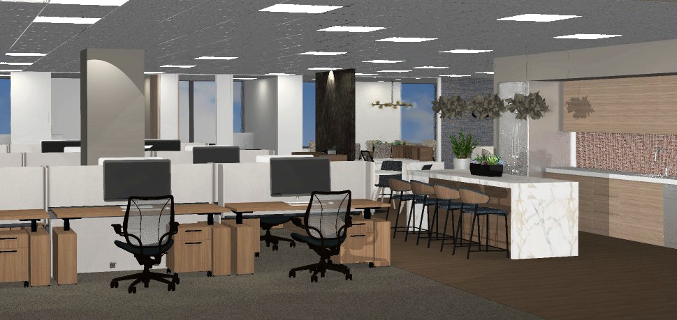 make the rendering look like a high end beautiful office interior with a bright clean ceiling with ceiling grid blue sky in the windows