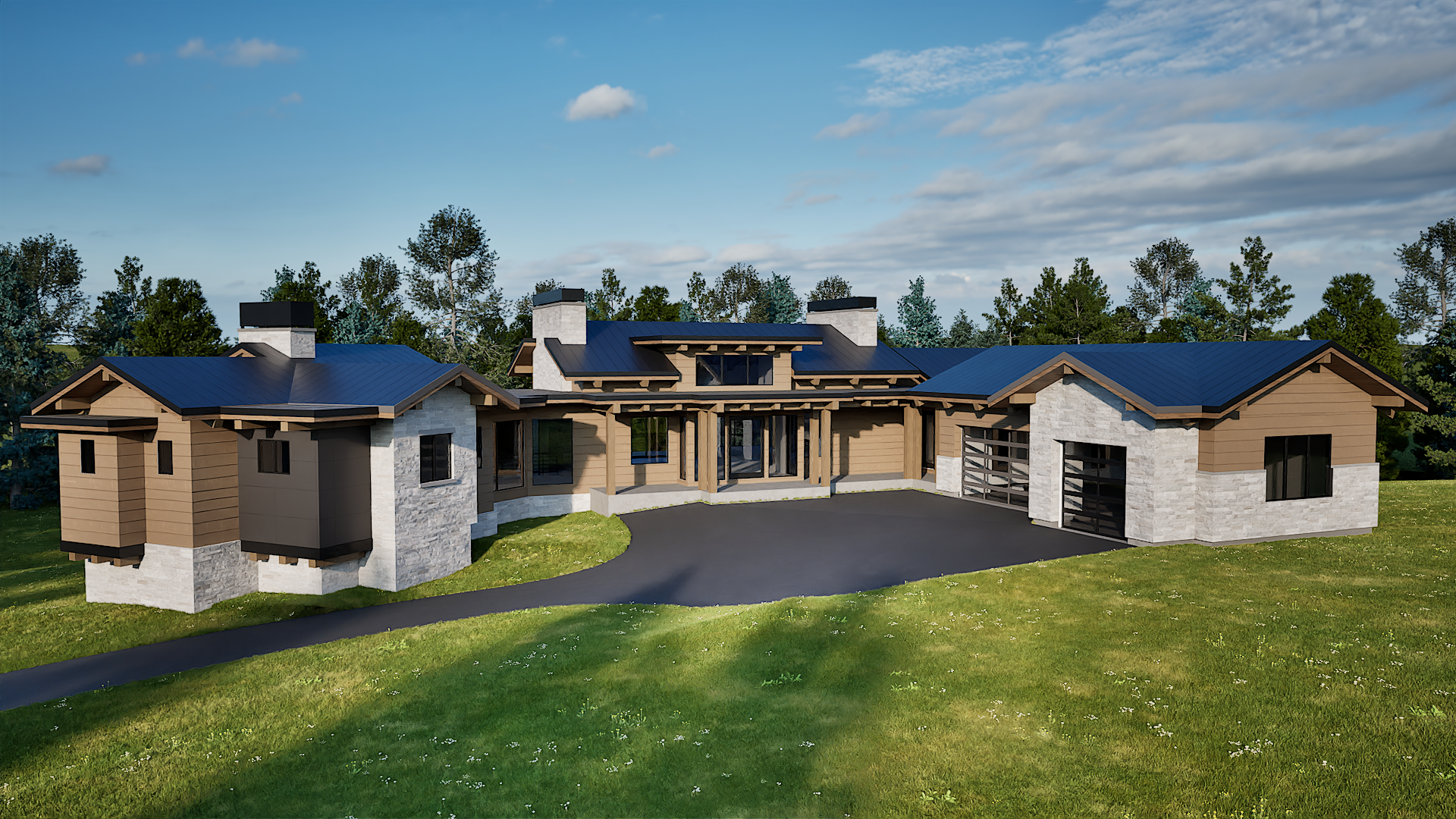 a mountain modern with brown horizontal wood siding black standing seam metal roofing the stone is creamy white clean cut dry stacked stone the driveway material to be dark asphalt with some stain and watermark details to make it look realistic retain the exact structure window arrangement patio columns balcony chimney rooflines foundation height and proportions exactly as shown in the reference image surround the property with a lush dense forest of tall mixed evergreens and hardwoods make the environment a bright sunny day with a few fluffy clouds add plants and landscaping around the exterior to add some color create ultra realistic lighting crisp shadows detailed textures in the wood siding and glass reflections depth render in hyper realistic architectural visualization quality 4k resolution