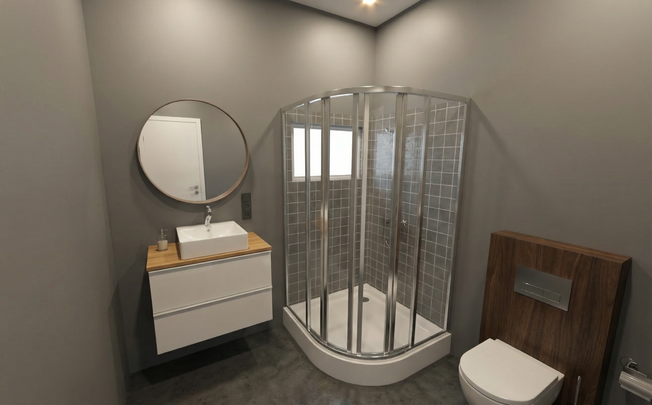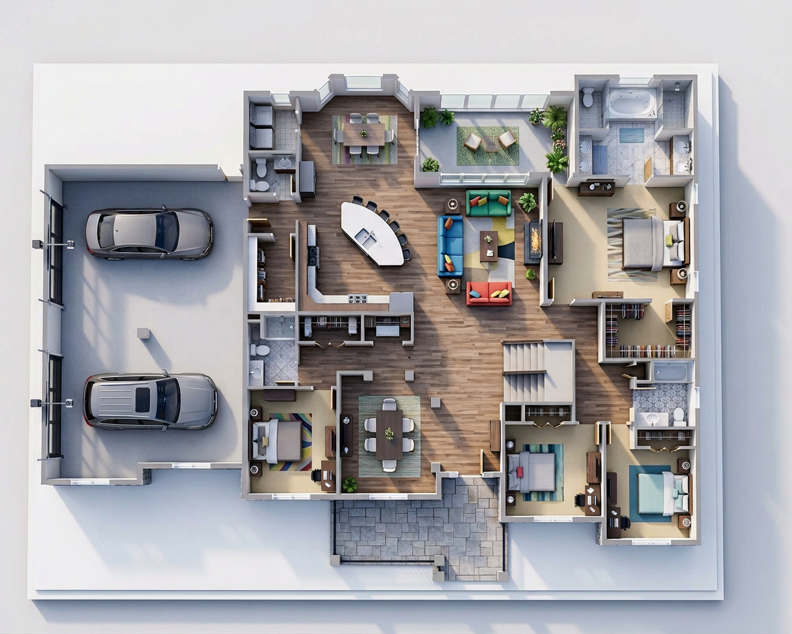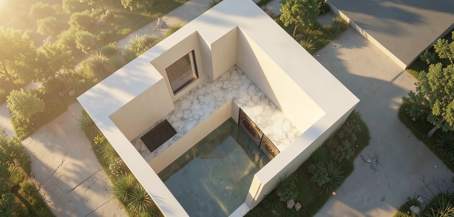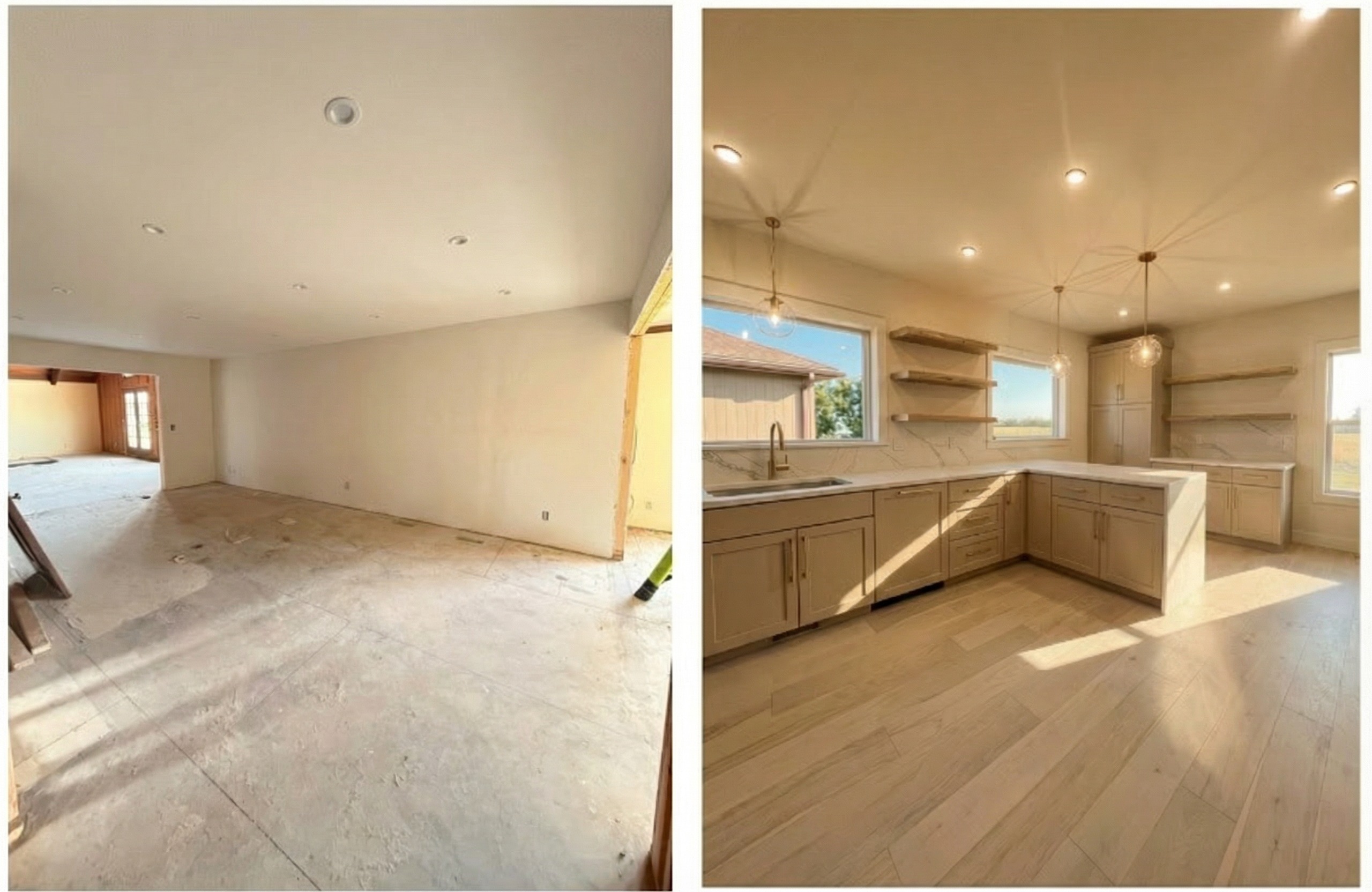 use the original unfinished image as a locked base plate preserve the exact camera angle lens perspective depth and spatial relationships do not alter wall positions ceiling height floor plan or opening locations place the kitchen only along the existing walls visible in the base image align all base cabinets directly against the back wall and right wall keep the open space on the left side unchanged position the sink centered under the existing window extend cabinetry along the right wall only following the exact wall length and perspective lines apply the style material cabinetry lighting from the reference image without changing layout or camera