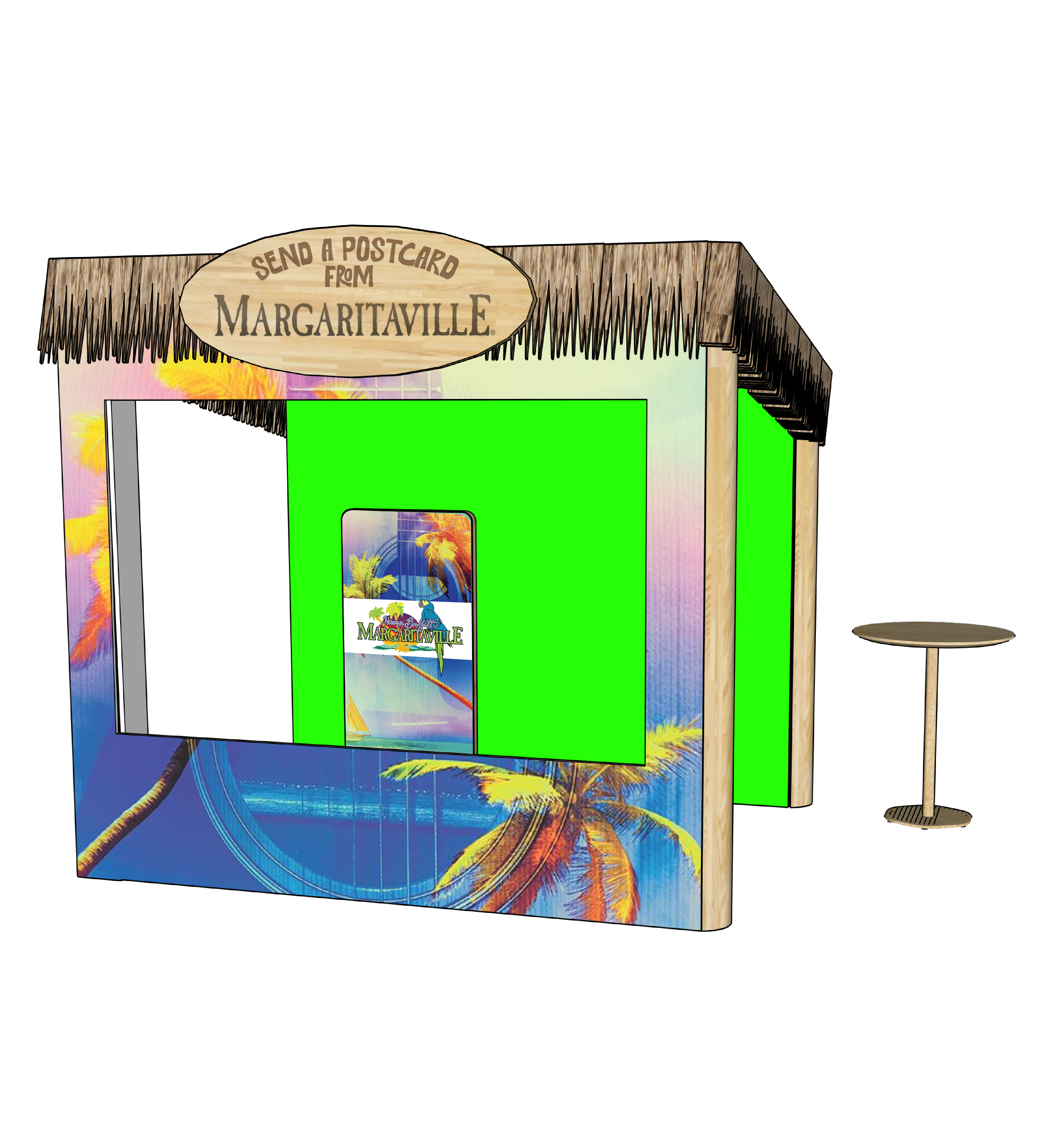 keep all materials colors text as is make more realistic roof is flat brown grass like a tiki hut there is a green screen wall place on a hardwood floor clean and bright atmosphere inside of structure is brightly lit walls behind structure are clean white without anything on them