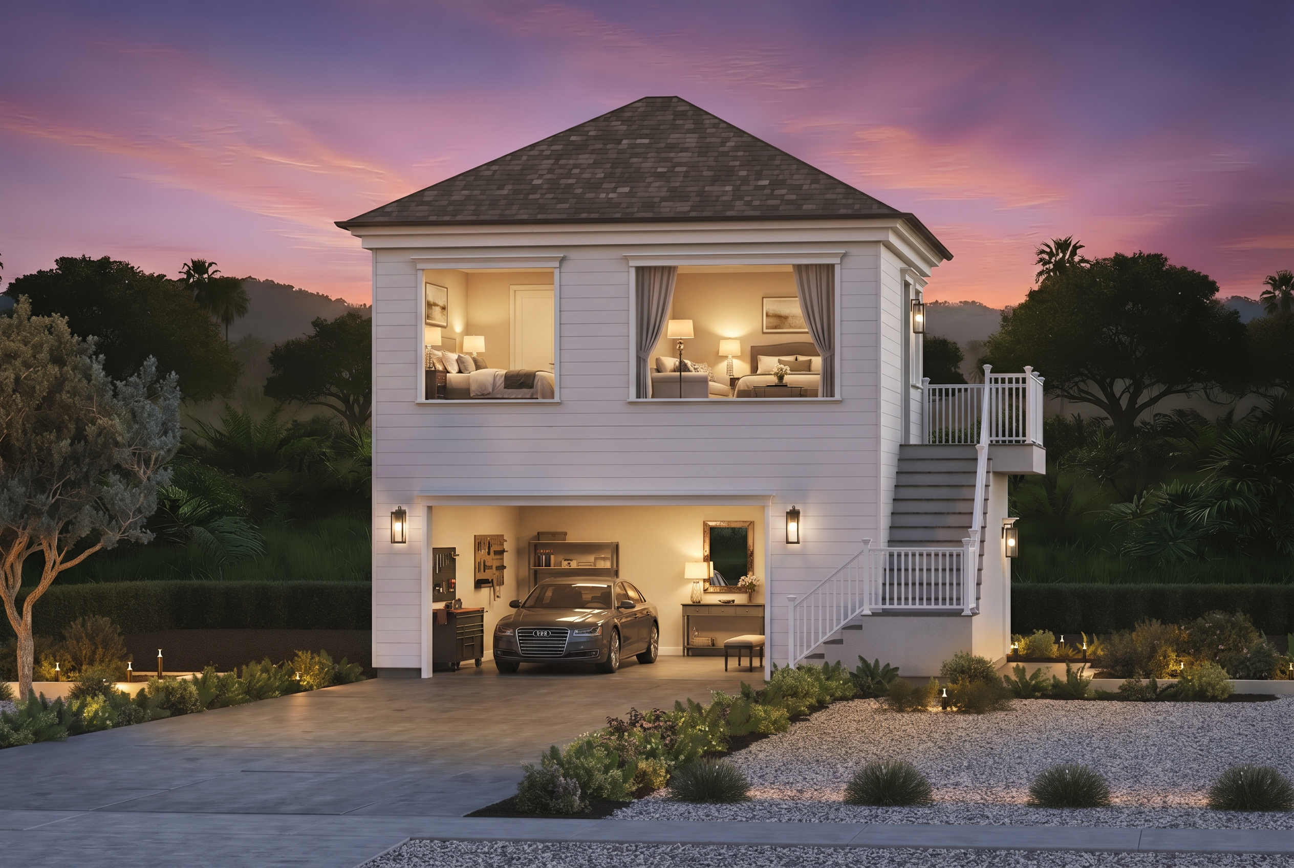 a simple context white render model background with pavement in foreground