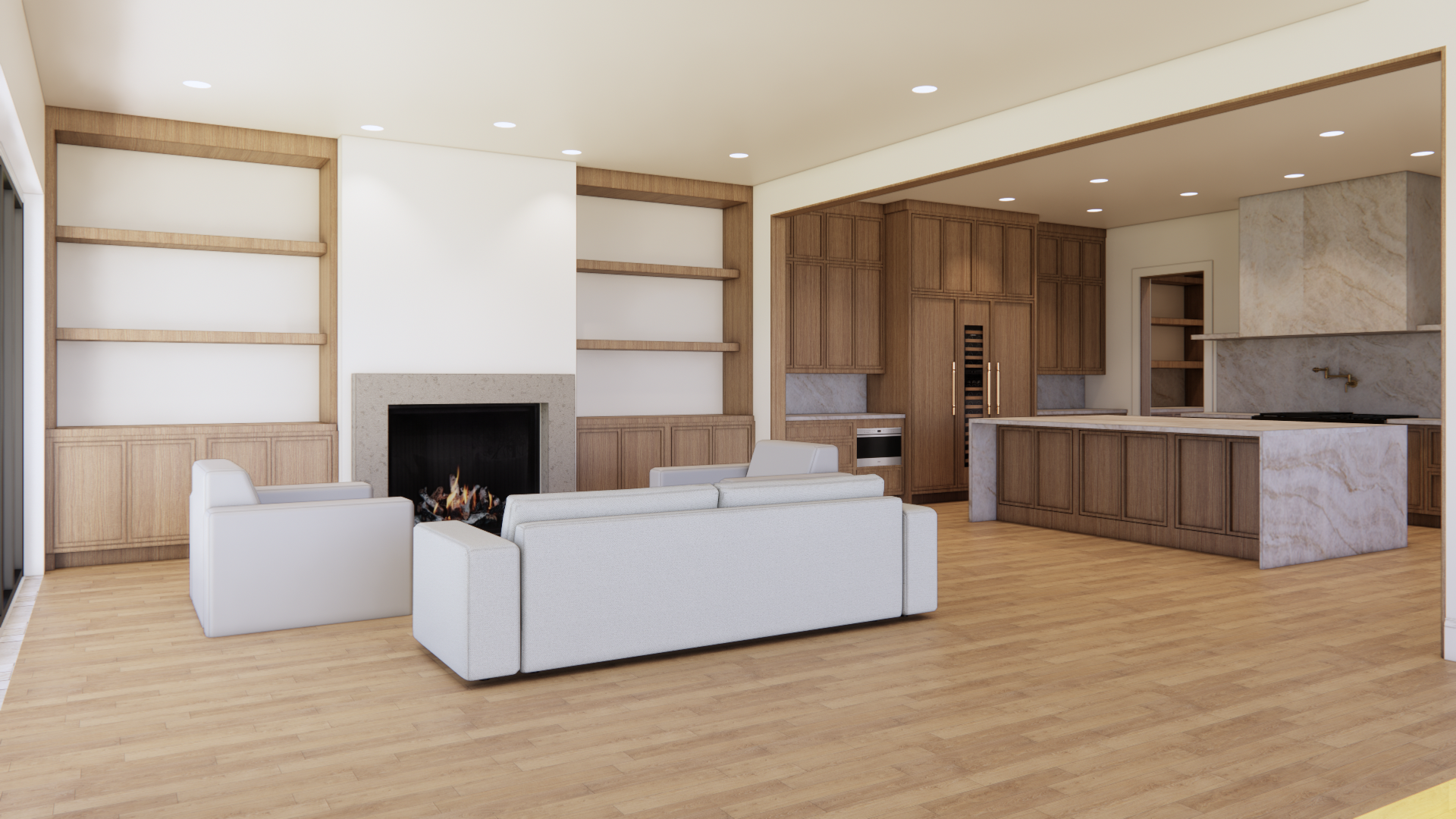 ultra photorealistic architectural rendering match the warm tonal palette of natural walnut cabinetry warm white plaster walls and creamy marble surfaces soft indirect lighting with warm under cabinet glow 3000k realistic global illumination subtle shadows and accurate material textures including wood grain honed marble veining and brushed brass fixtures natural daylight entering from the right side high end luxury residential interior photography style 35mm lens balanced exposure soft contrast highly detailed materials architectural digest quality
