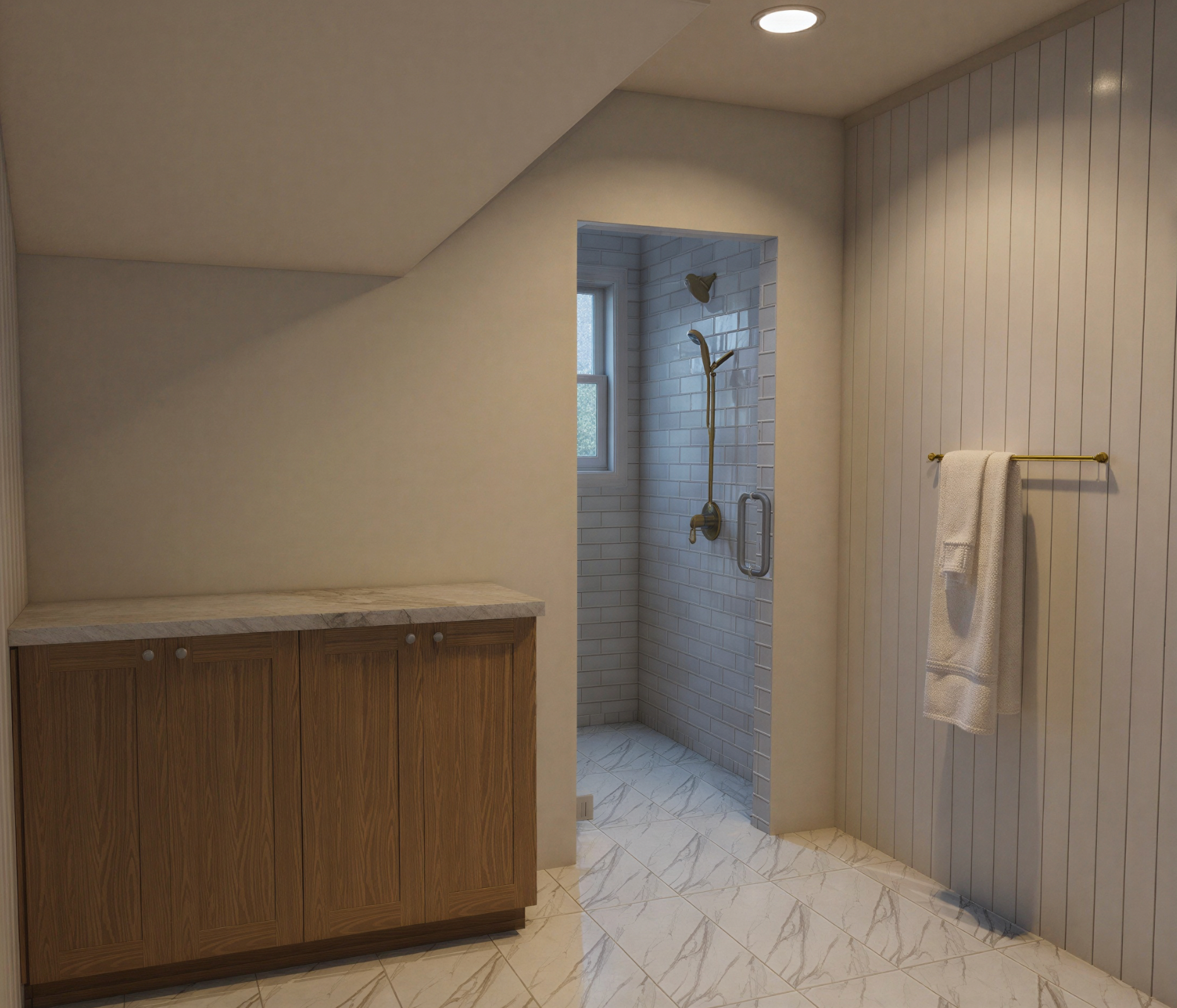 show this render to be very well lit show a chair rail on the right side wall with wallpaper above it