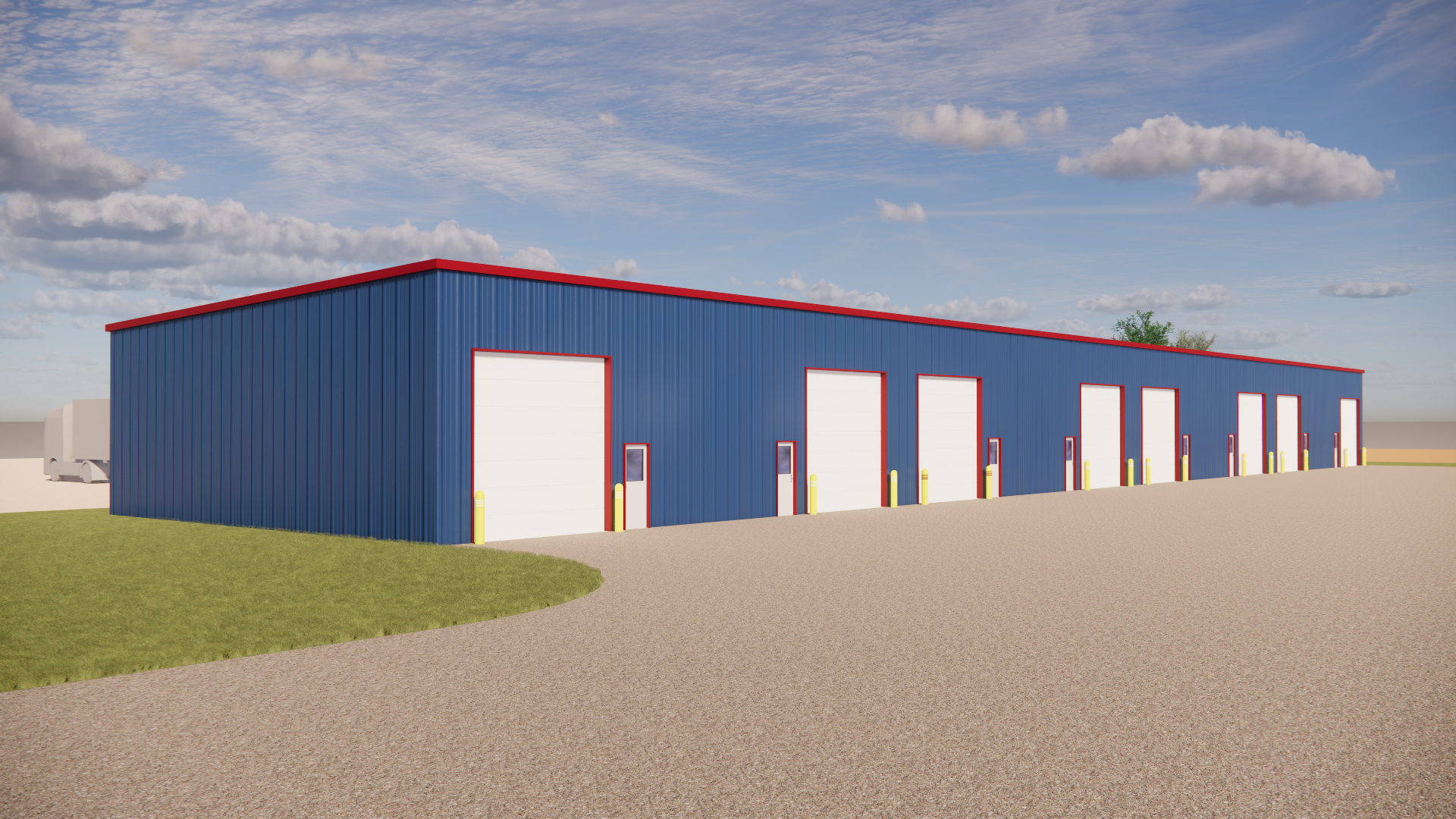 gravel lot grass where shown distant farm fields in the background dark blue steel panels with red trim