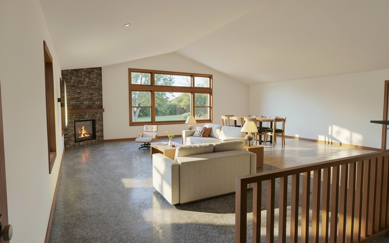a house on a shale cliff overlooking a wide deep lake surrounded by hemock and oak trees hot dipped galvanised steel foundations black horizontal wood siding on roof cocrete lower level