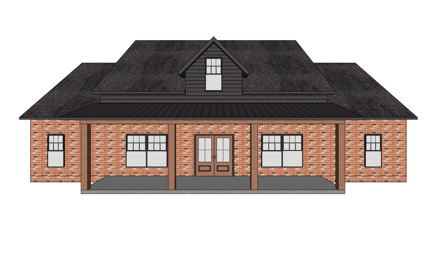 render a charming house with dark gray shake and a roof providing a rustic yet modern appeal the front porch features wooden columns with a warm oak finish and a standing seam black metal roof the lower facade is accentuated with orange and black brickwork adding a classic touch black windows offer a subtle contrast inviting warmth into the design the atmosphere is serene and inviting under a clear sunny sky farmland with rolling hills surrounds the house with gentle shadows cast by the sunlight for a cozy ambiance landscaping in front driveway on the right side