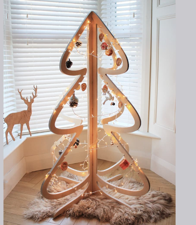 the image shows a wooden christmas tree with teeth for hanging ornaments and the ornaments will remain fixed however the background image should be changed to a light soft background to suit the christmas spirit