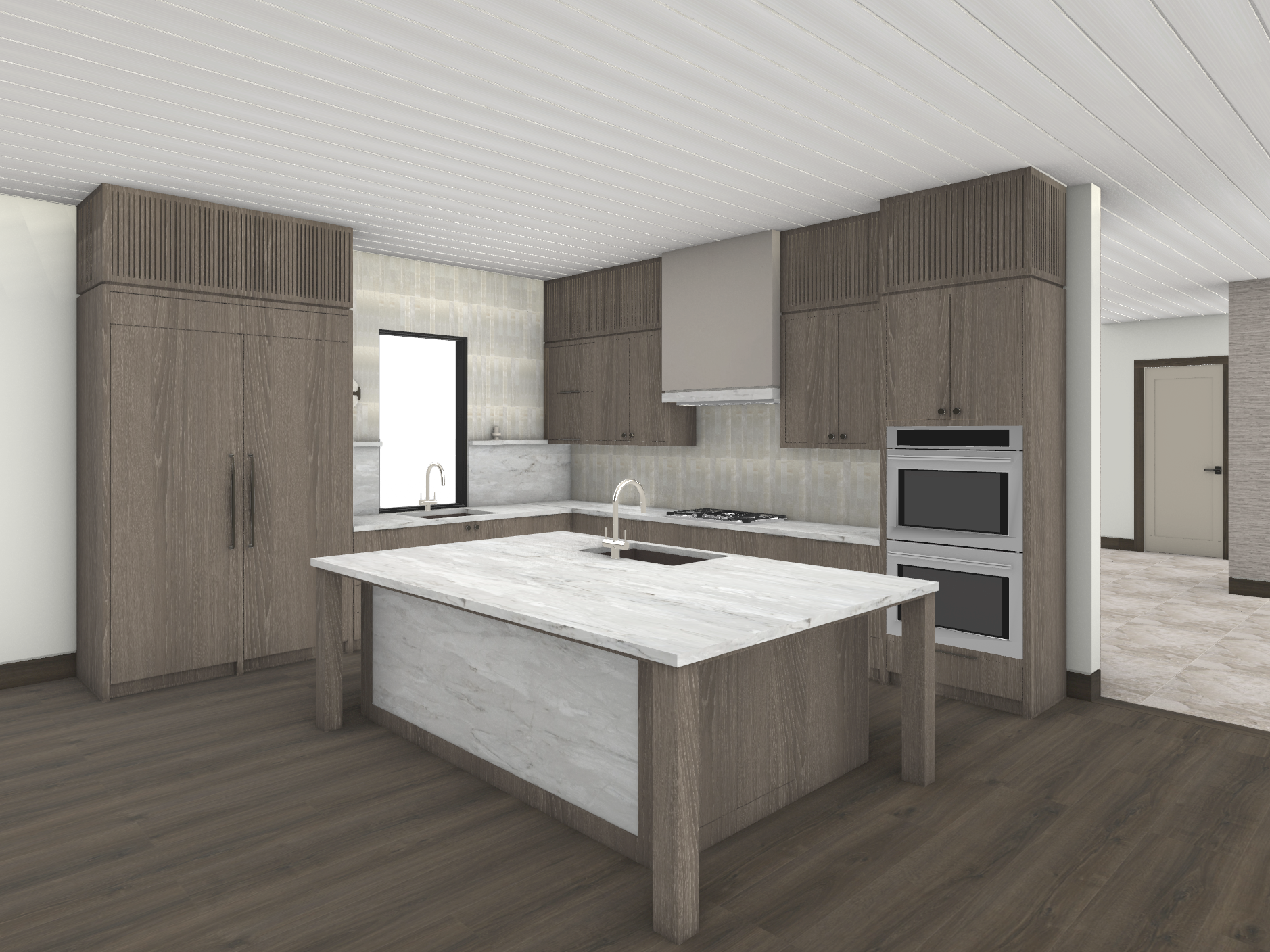 adjust lighting to be natural add a few neutral accessories to kitchen and island counter maintain colors and materials add a lake view to window add light under cabinets ceiling white wood finish don t change anything else