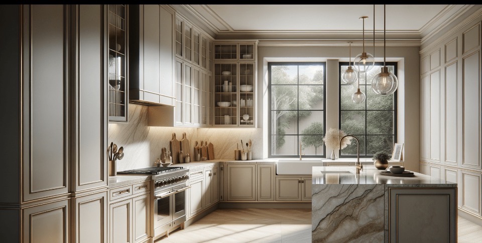 render this style of kitchen with the tile below as the backsplash the stone below and the pendants below soft luxury earthy calm high end materials timeless palette pottery barn warmth nature connected feel