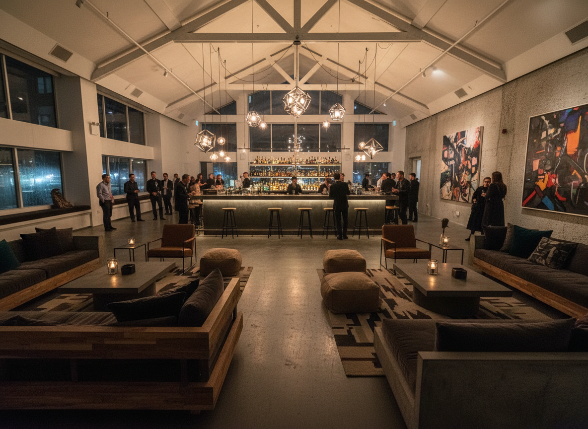make it night time this is a soho hotspot inspired by the iconic artist salon loft parties of the 80s and 90s there is a central island bar moody lighting plush conversational lounge seating that feels intimate but energizes the space materials are elevated warm lighting is low and focused remove the metal panels from the ceiling and reveal an exposed ceiling typical of a ny loft furnishings are modern bohemian brutalist with clean lines lighting is utilitarian but feels artist crafted everything is high design the bar should be a focal point where mixologists are also artists and their craft is performative do not change the architectural structure of the input photo