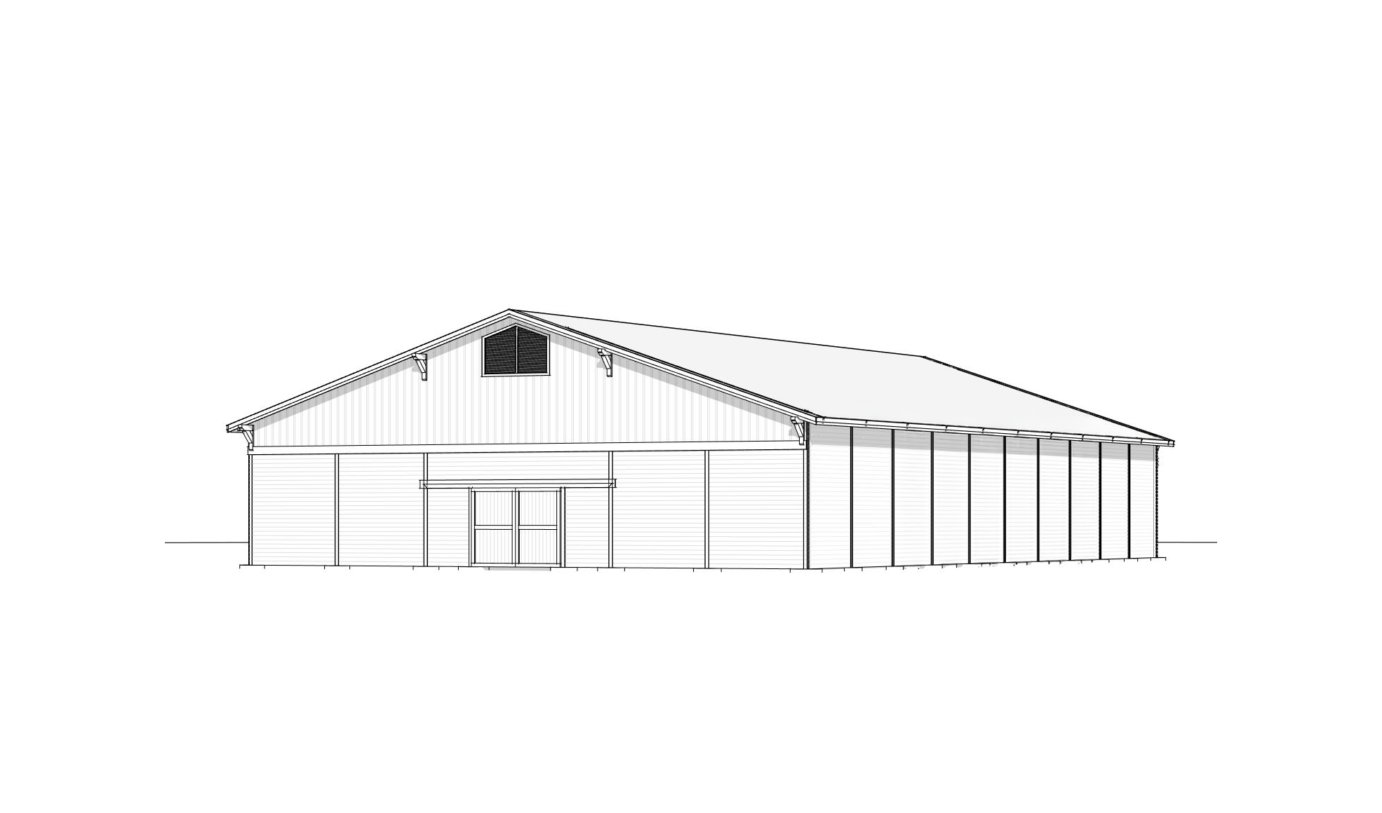 clean equestrian horseback riding arena architectural open air exterior arena rendered in cinematic golden hour lighting with blue skies and vibrant clouds enclosed horse arena in a lush beautiful forest setting with green grass and dense trees surrounding the property select grade horizontal cedar siding on the lower part of the structure and douglas fir board and batten on the upper portion of the arena green manicured landscape around structure with gardens and grass black standing seam metal roof high fidelity photorealistic visualization crisp shadow falloff refined facade geometry soft atmospheric depth premium architectural photography mood ultra clean composition and materials photorealistic render prominent trees scattered around the property black posts black trim around wood barn doors lower and upper sides of the structure have horizontal cedar wood siding