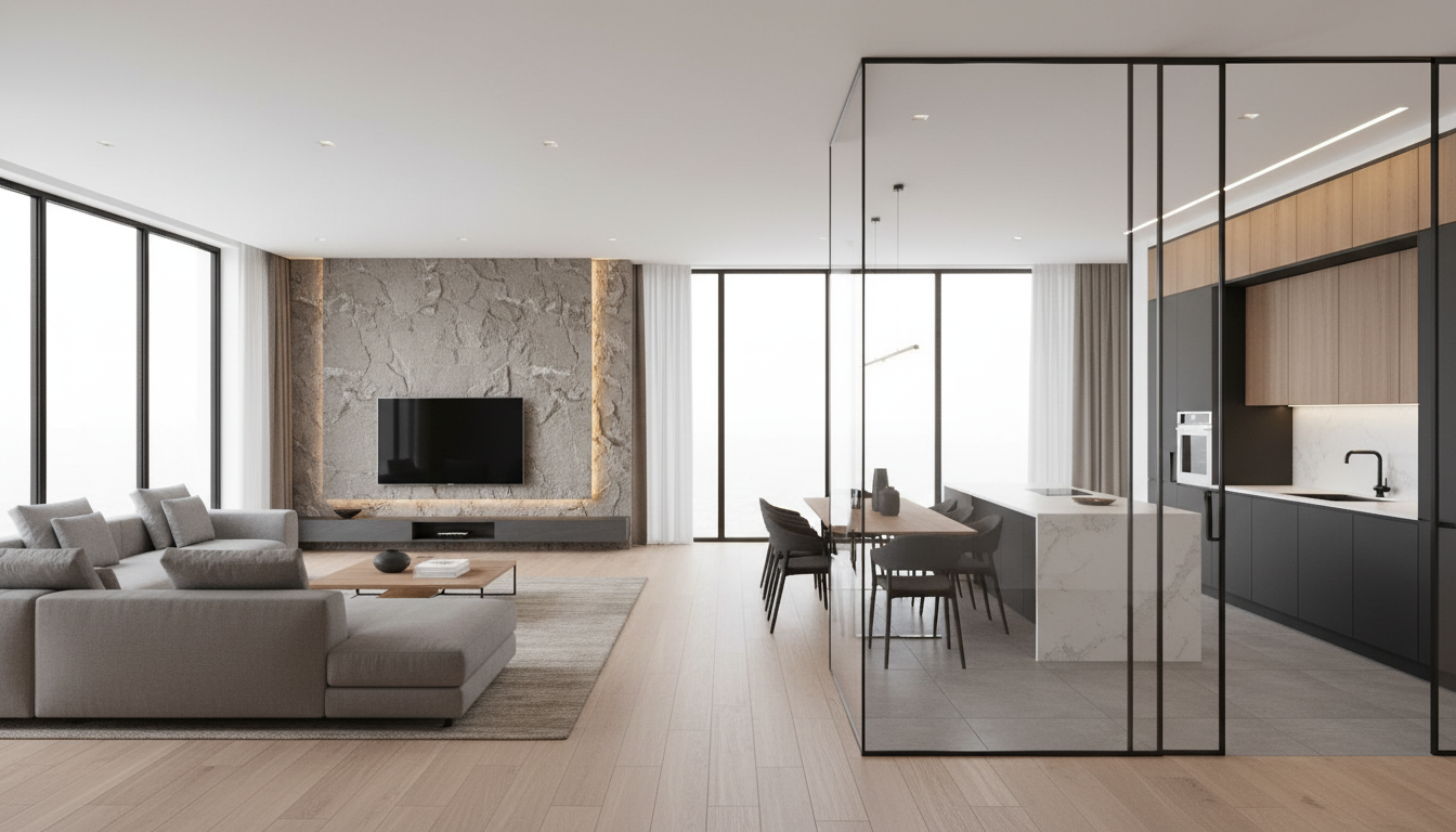 1 living room stone wall behind tv prompt ultra modern living room interior large natural stone feature wall behind a floating tv minimalist design warm ambient led lighting integrated in the wall large modern sofa in neutral colors modern wood coffee table with black metal legs light oak flooring floor to ceiling windows elegant decor architectural lighting luxury modern home photorealistic 8k render interior design magazine style 2 living room sofa modern table prompt contemporary luxury living room with large modern sectional sofa solid wood coffee table with black steel legs minimalist decor neutral color palette indirect lighting textured walls large rug elegant modern interior architecture spacious open living room premium materials soft natural light photorealistic high end interior design 3 living room stone wood contrast prompt modern open space living room with textured stone wall tv feature floating media unit wood and black metal furniture large comfortable sofa hidden led strips modern minimalist interior natural materials warm tones scandinavian modern style photorealistic architectural render 4 modern kitchen prompt luxury modern kitchen interior handleless cabinets matte black and warm wood finishes large kitchen island with waterfall countertop built in appliances minimalistic design indirect led lighting under cabinets large windows elegant modern home kitchen ultra realistic architectural visualization 5 modern bathroom prompt modern luxury bathroom with walk in glass shower floating vanity with wood texture matte black fixtures large format stone tiles indirect led mirror lighting minimalist spa atmosphere elegant modern bathroom interior high end architectural render photorealistic 6 bathroom stone spa style prompt minimalist spa style modern bathroom natural stone walls freestanding bathtub floating wood vanity soft warm led lighting black fixtures large modern tiles luxury hotel style bathroom calm relaxing atmosphere photorealistic render 7 open space living kitchen prompt modern space living room and kitchen divided by glass wall and slide glass dors stone accent wall with tv large sectional sofa wood coffee table with black legs minimalist kitchen with island warm led lighting large windows contemporary luxury house interior architectural visualization ultra realistic